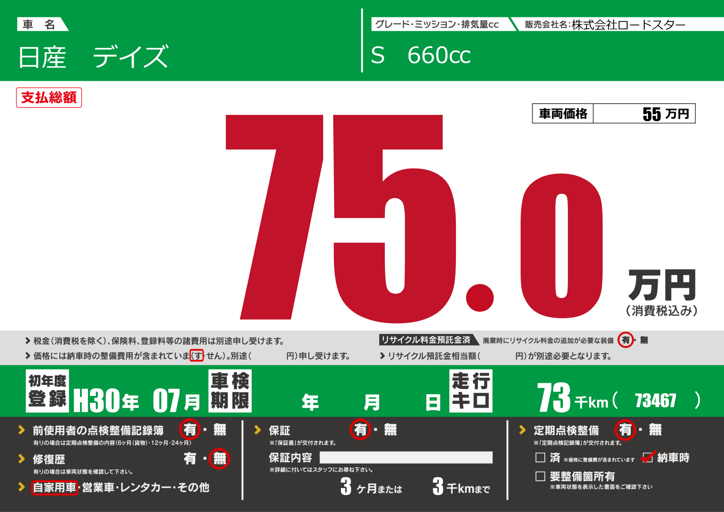 | 定期点検整備 | 定期点検整備あり 納車時あり | ||