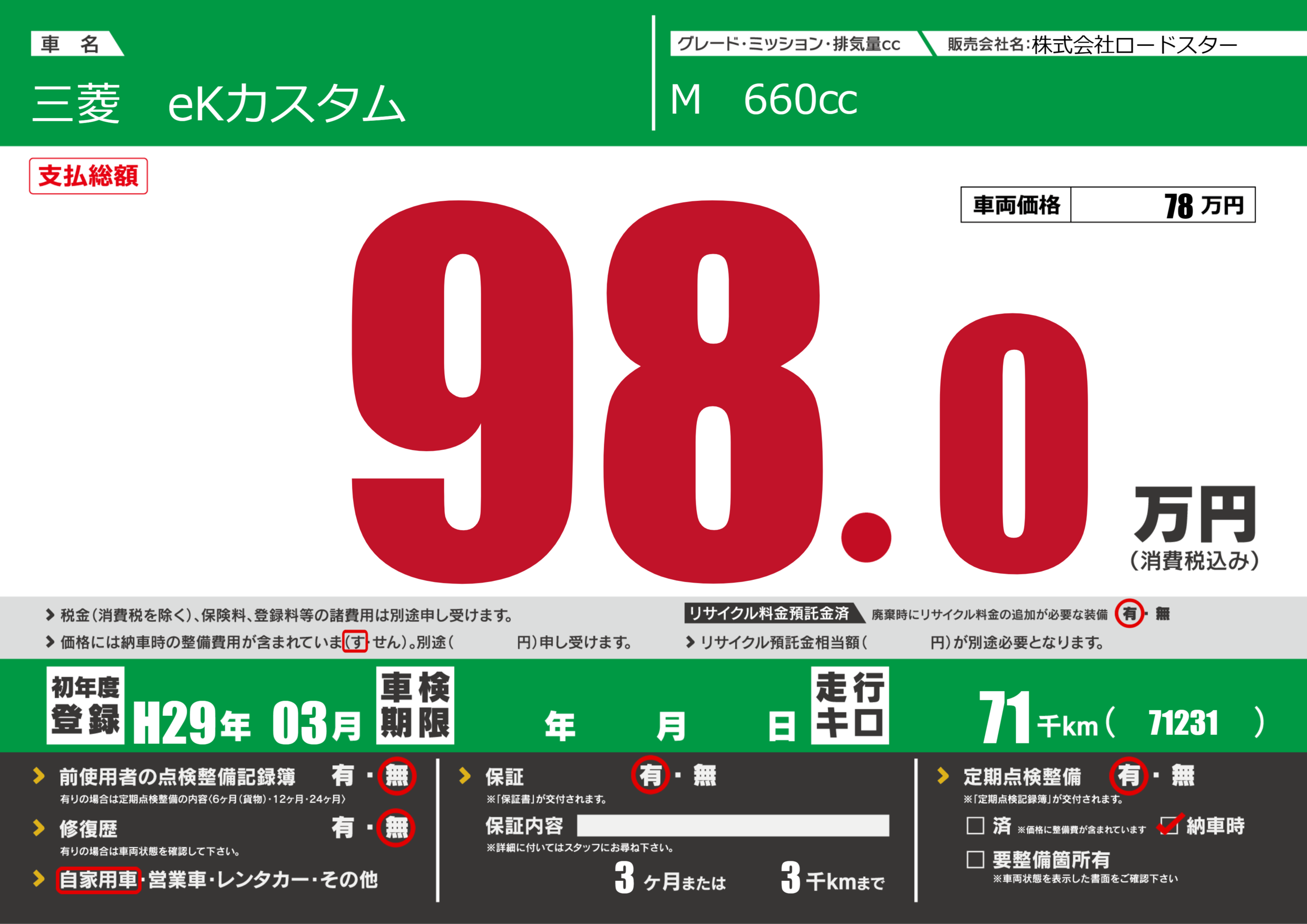 | 定期点検整備 | 定期点検整備あり 納車時あり | ||