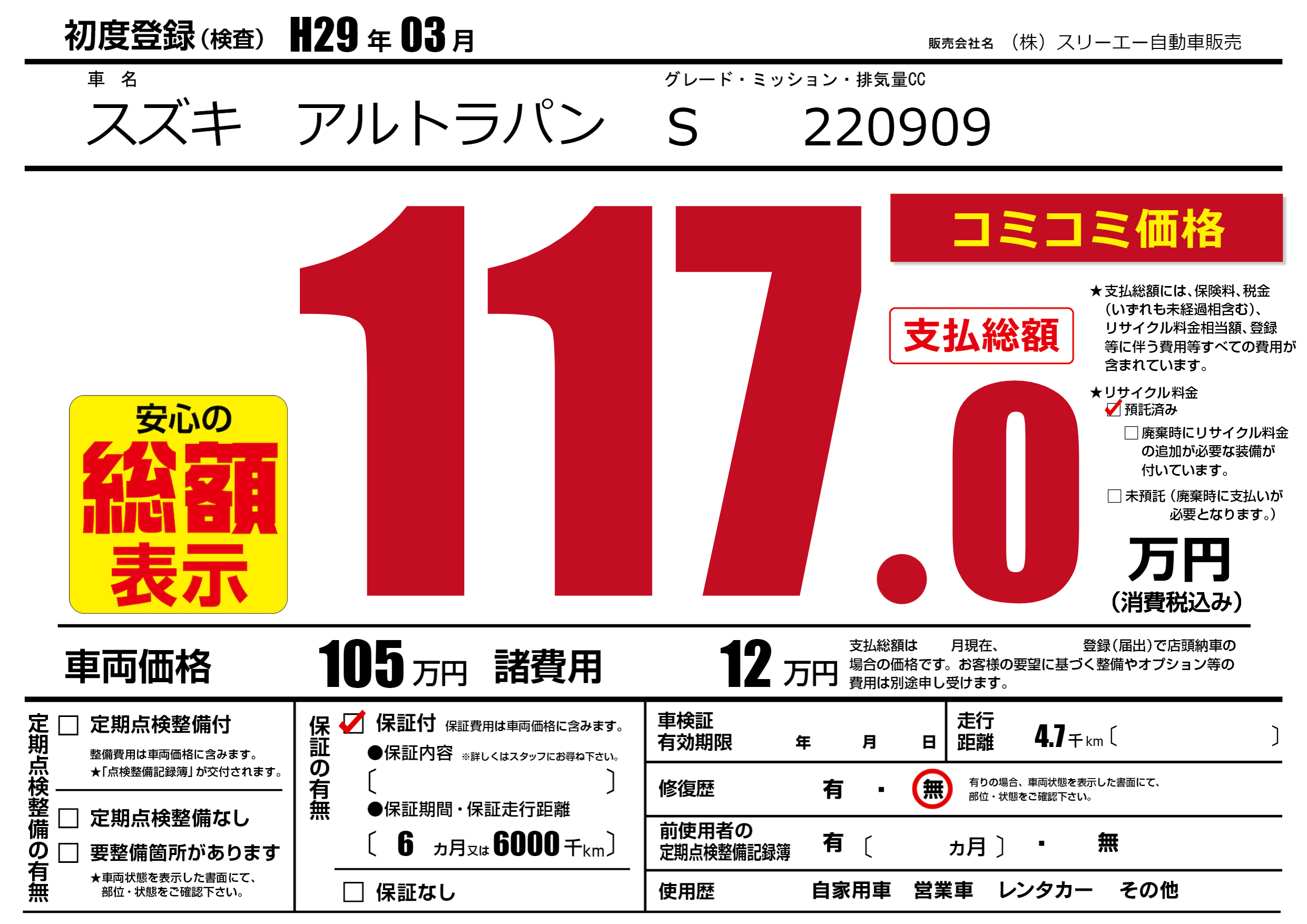 保証付き 保証内容(---) 6ヶ月または(6000)千kmまで |