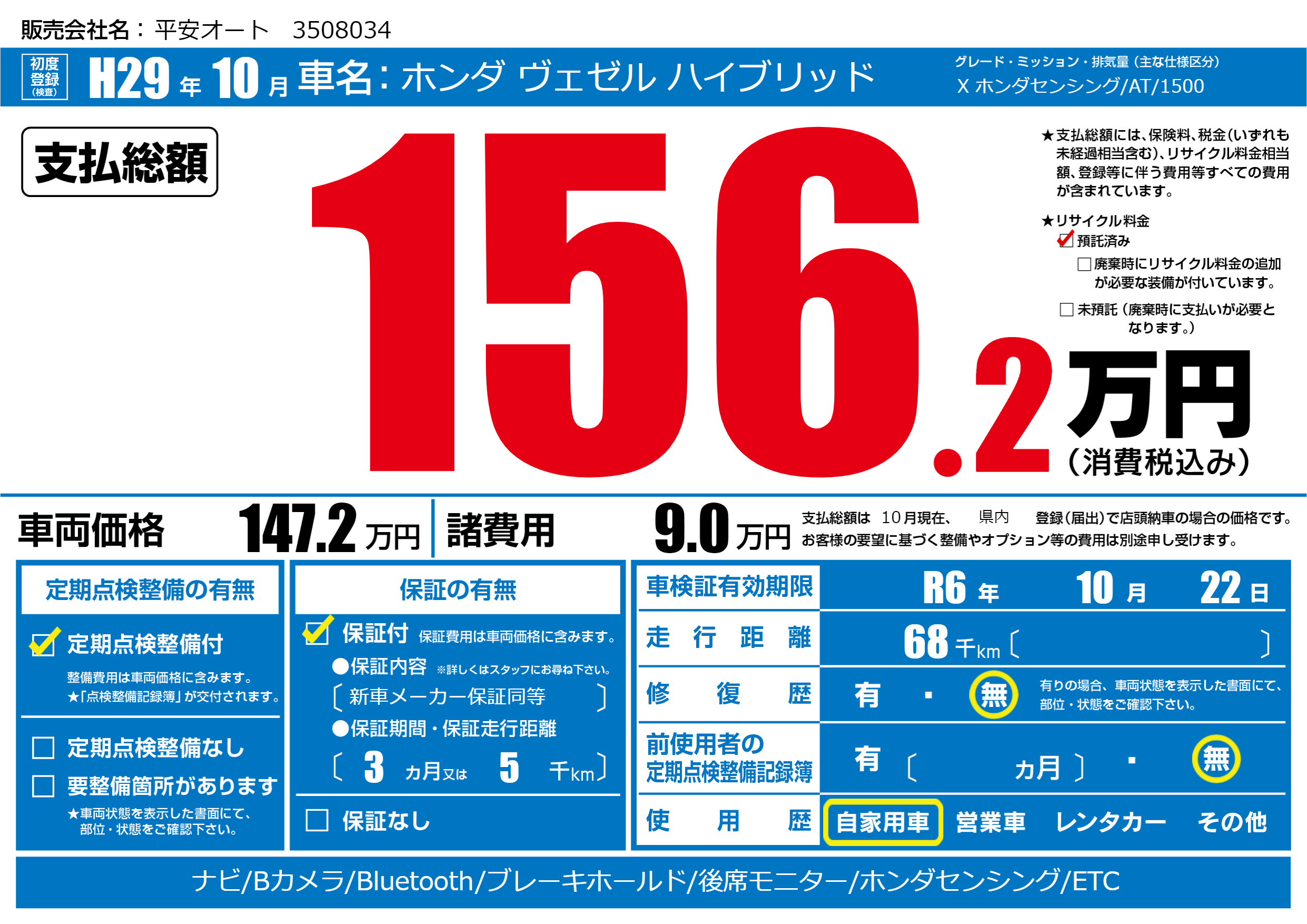 なし | 車検制限 | R6年10月22月 |