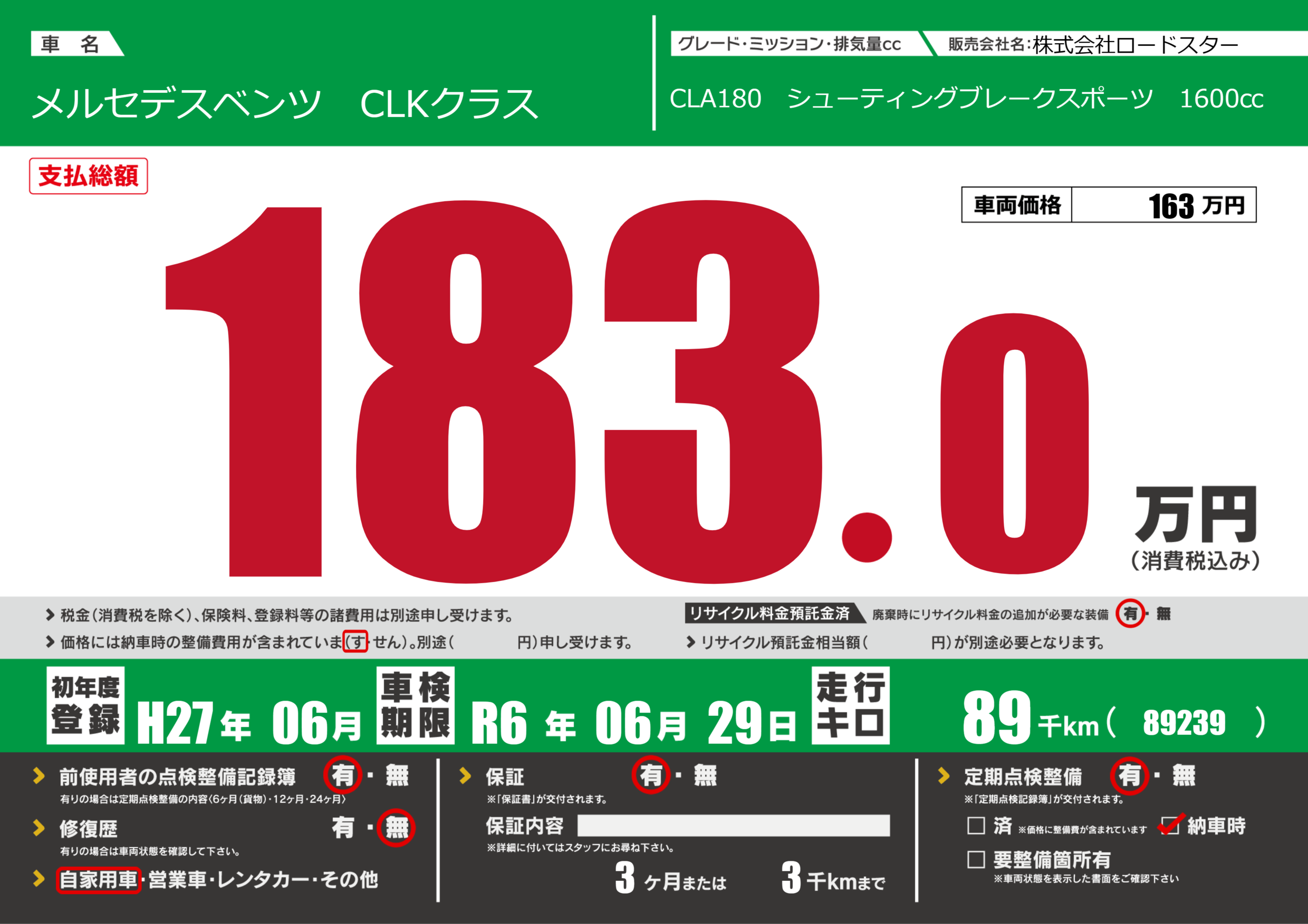 | 定期点検整備 | 定期点検整備あり 納車時あり | ||