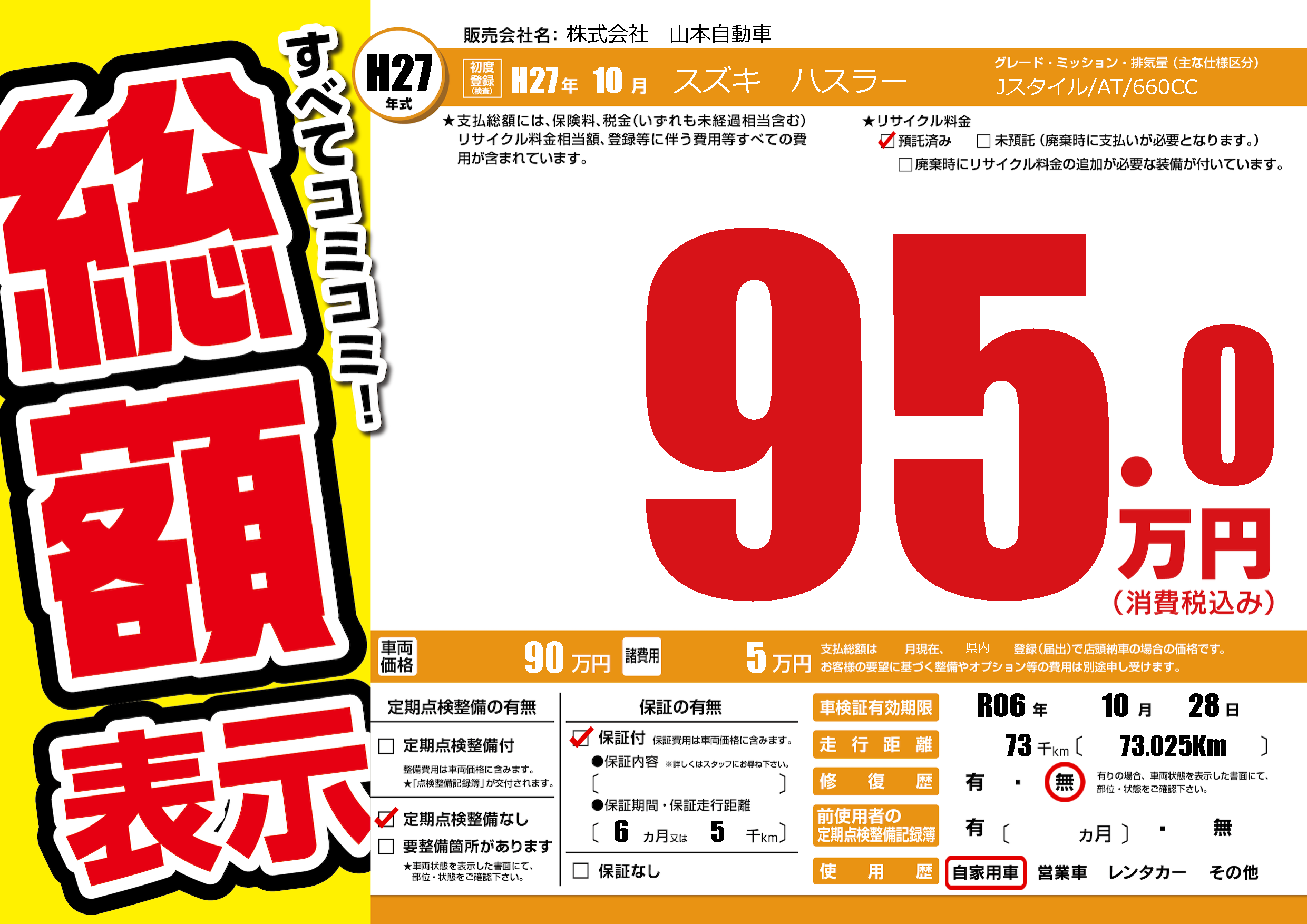 | 車名 | スズキ ハスラー | グレード ミッション 排気量 |