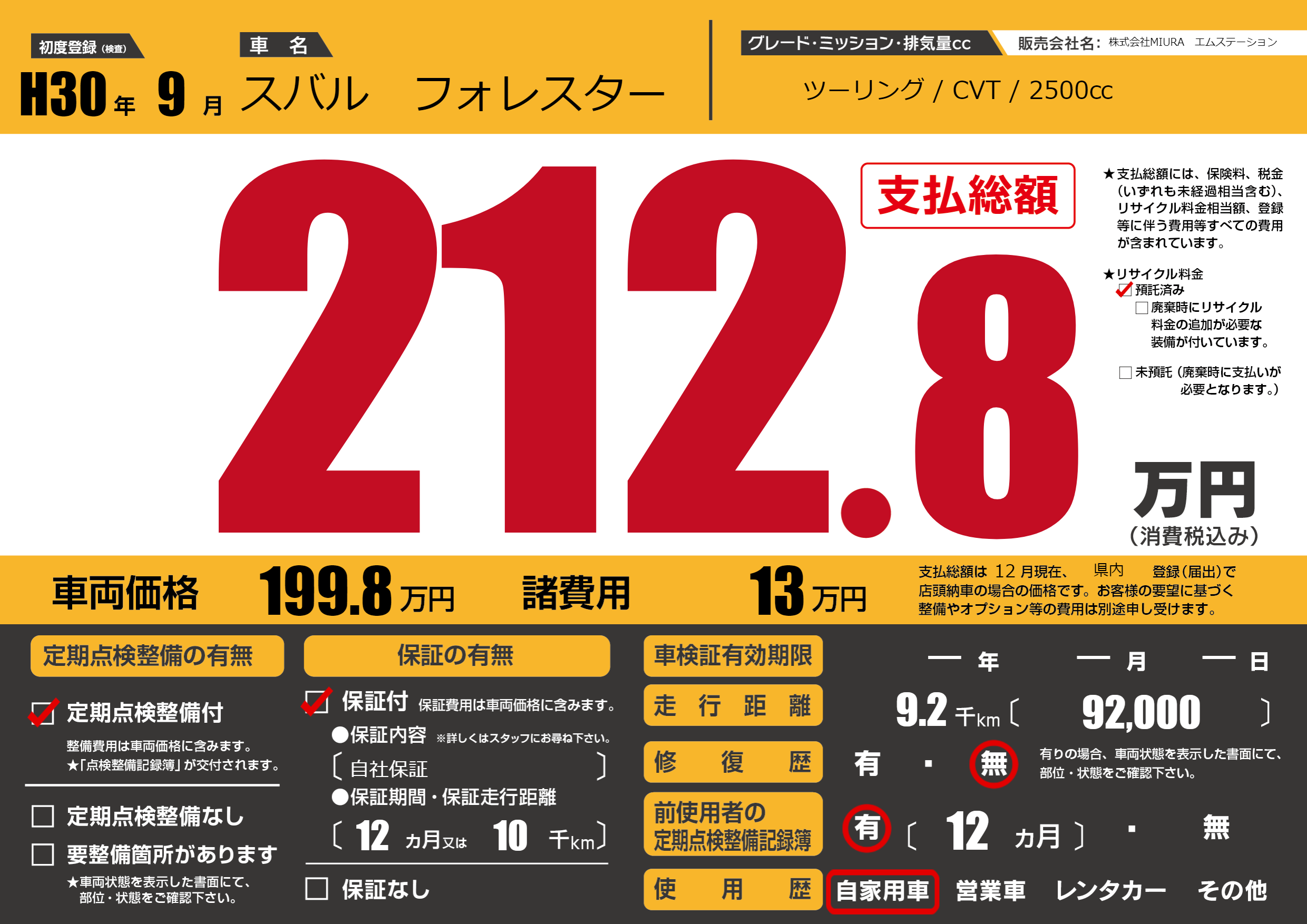 | 車名 | スバル フォレスター | グレード ミッション 排気量 |