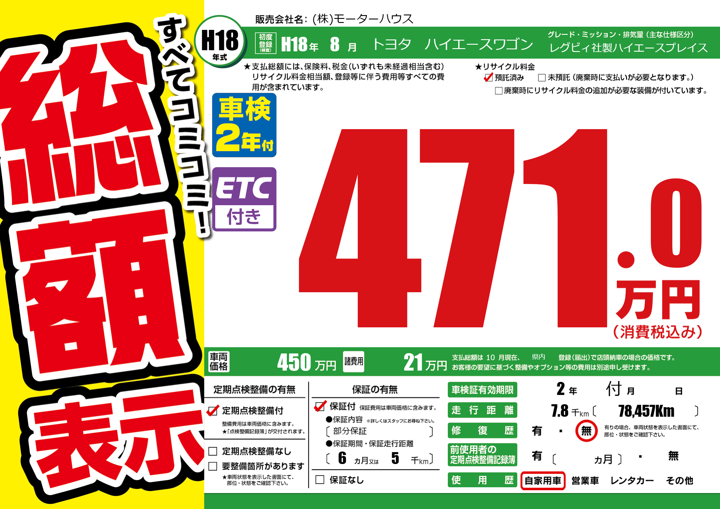 | 走行キロ | 0.7万km | 初年度登録 | H18年8月 |