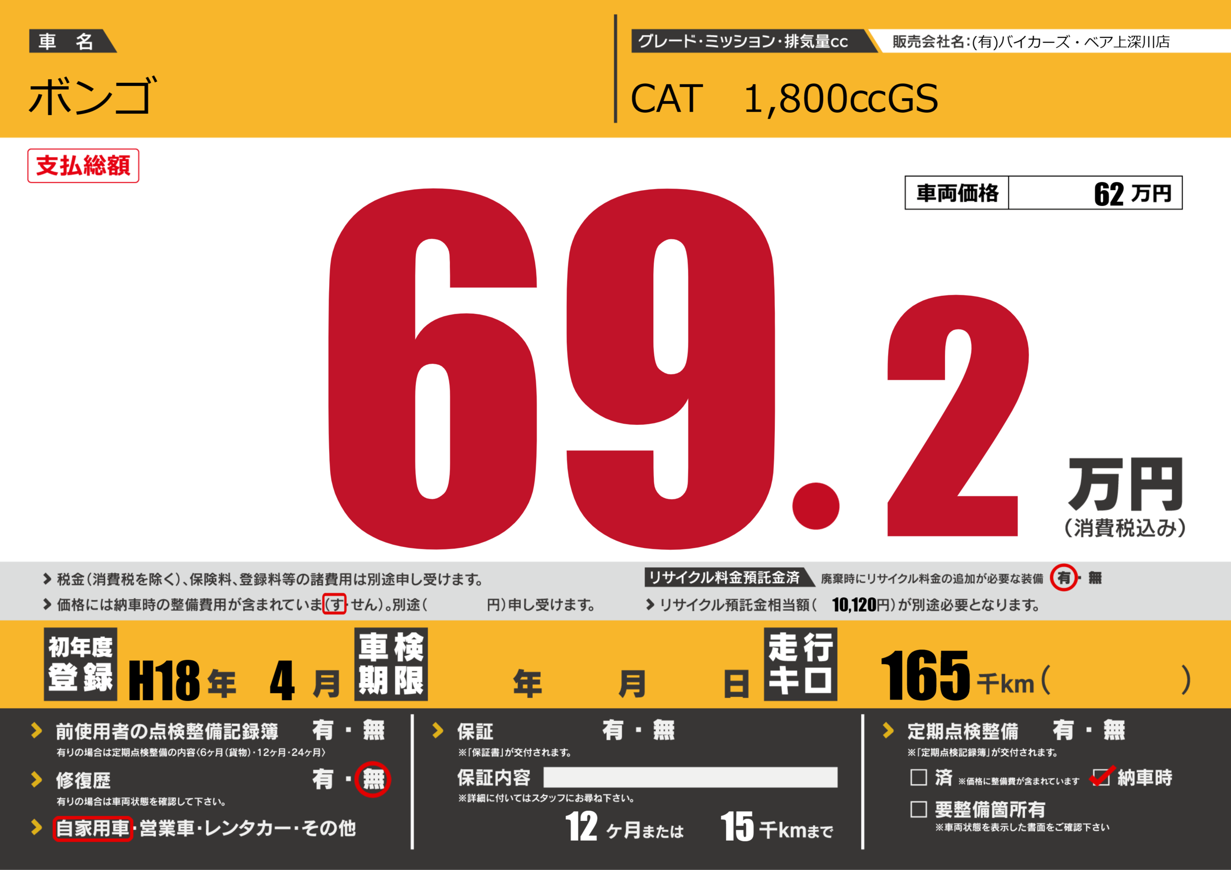 | 車名 | ボンゴ | グレード ミッション 排気量 |