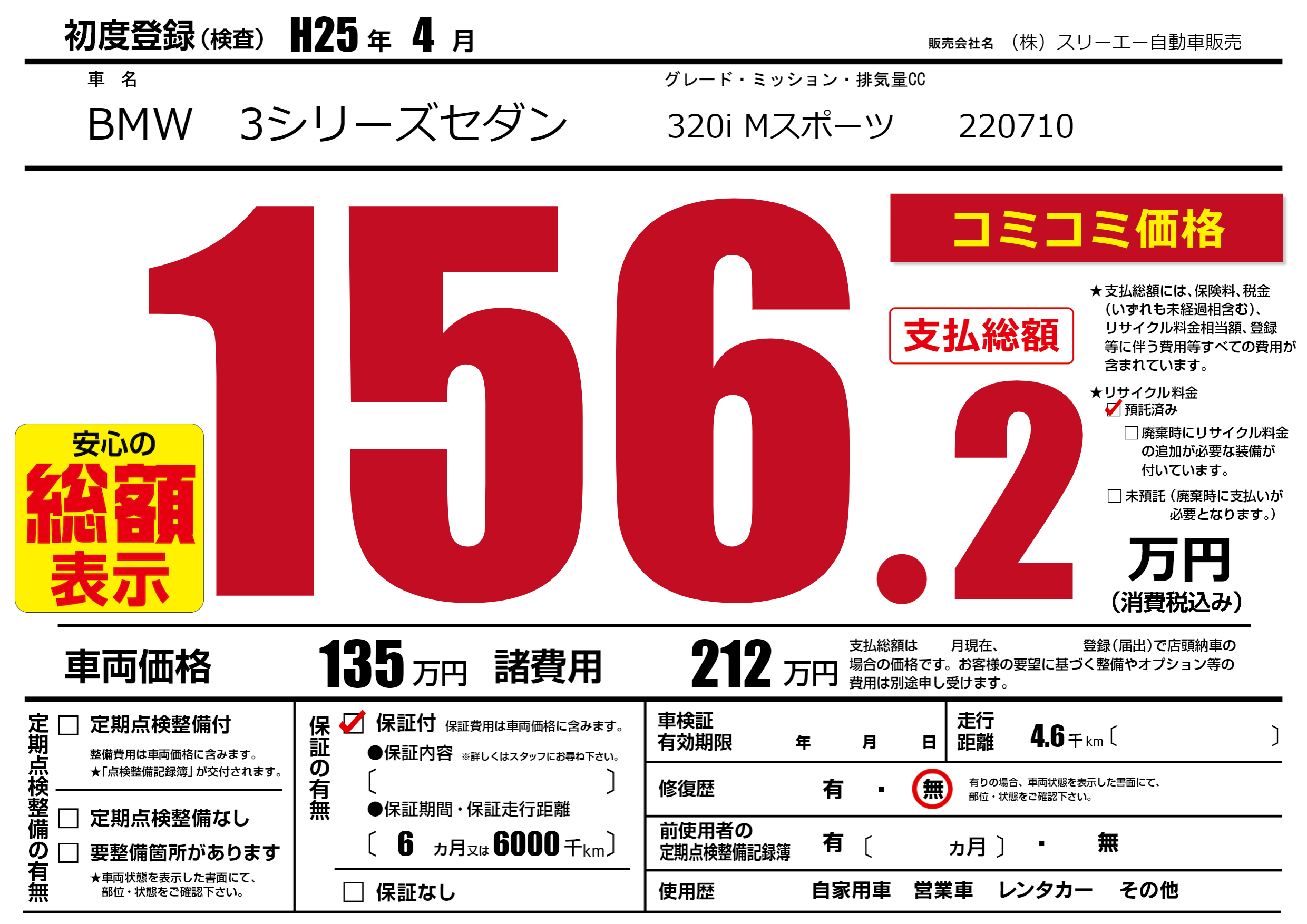 | 車名 | BMW 3シリーズセダン | グレード ミッション 排気量 |