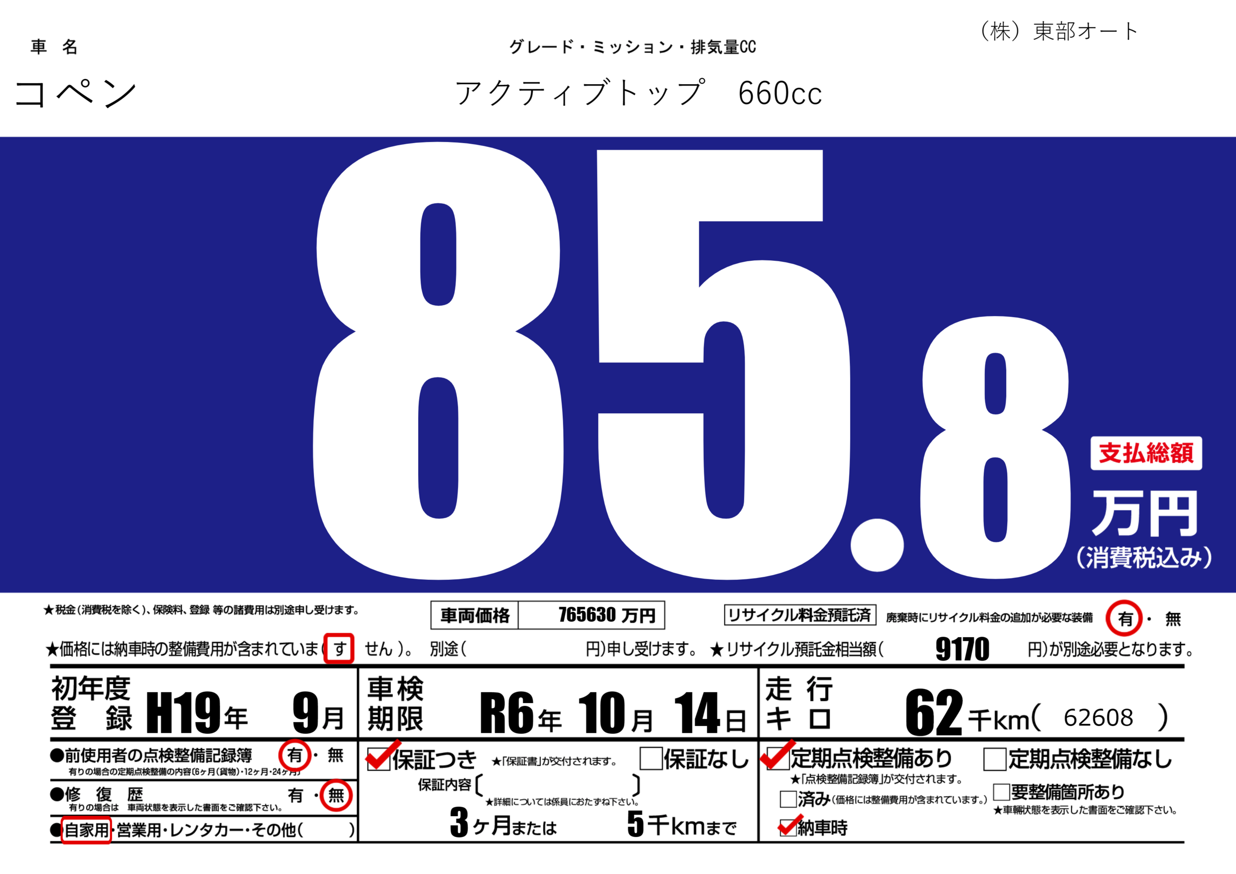| 定期点検整備 | 定期点検整備あり 納車時あり | ||