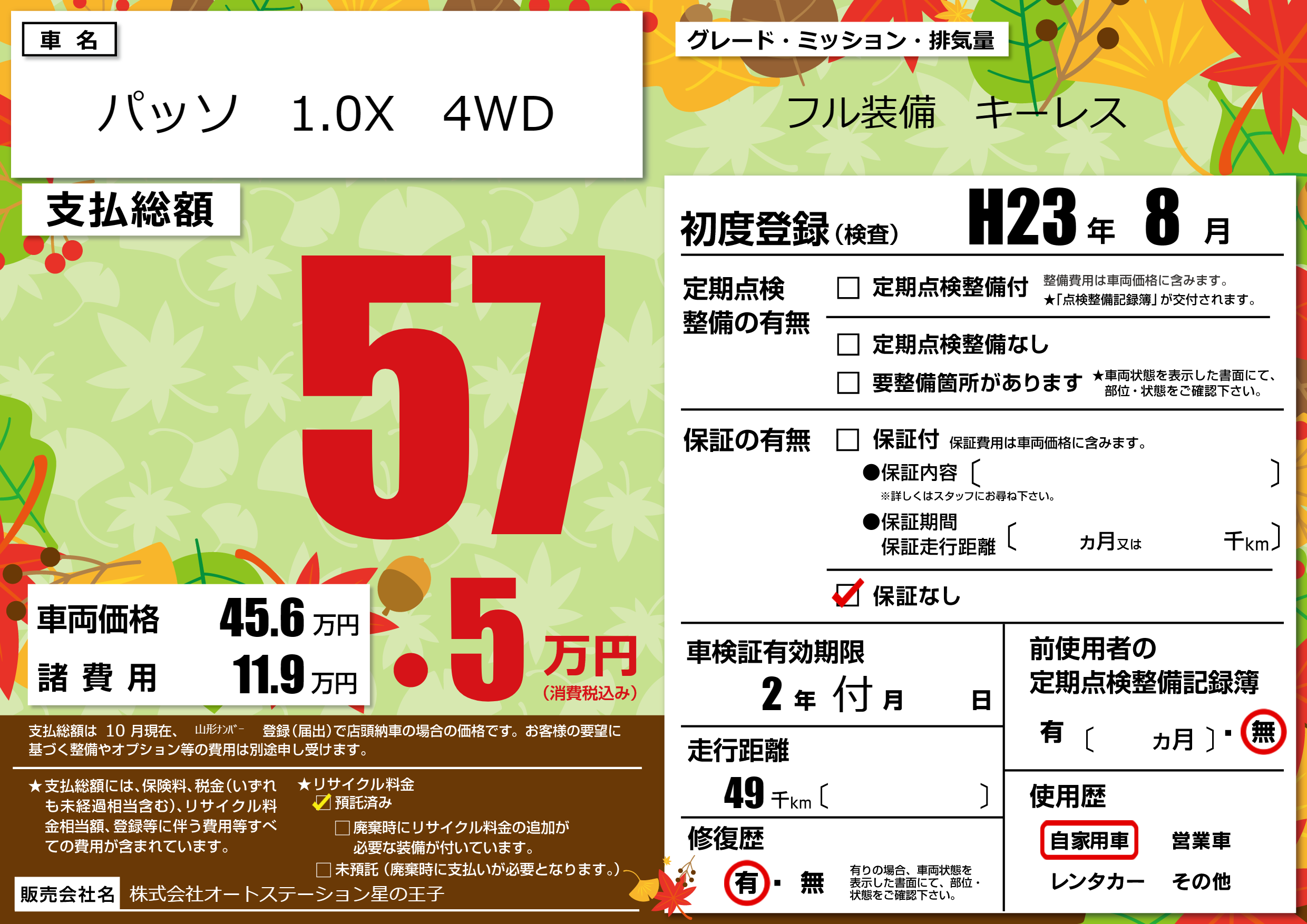 | 車名 | パッソ 1.0X 4WD | グレード ミッション 排気量 |