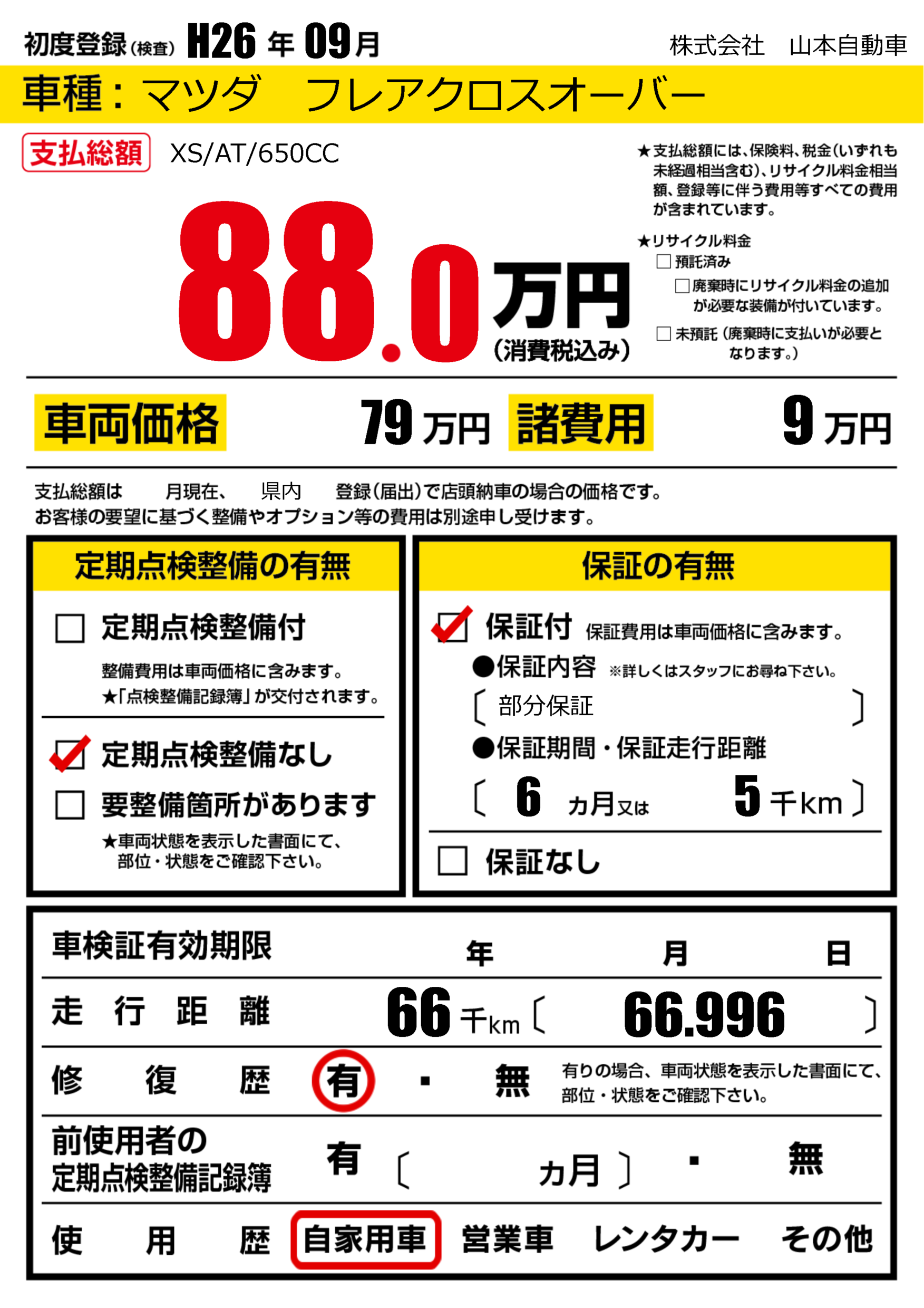 | 走行キロ | 6.6万km | 初年度登録 | H26年09月 |