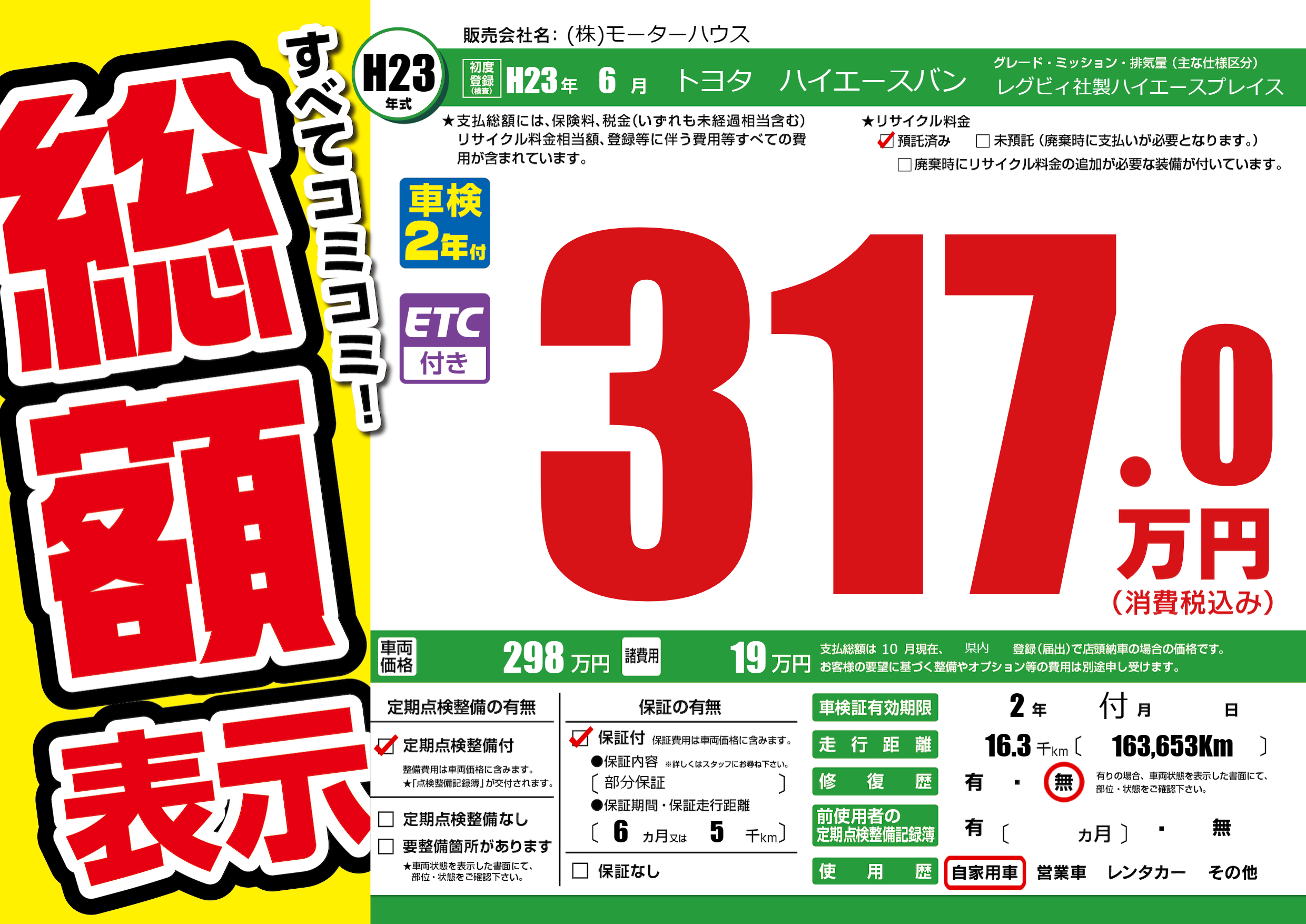 | 車名 | トヨタ ハイエースバン | グレード ミッション 排気量 |