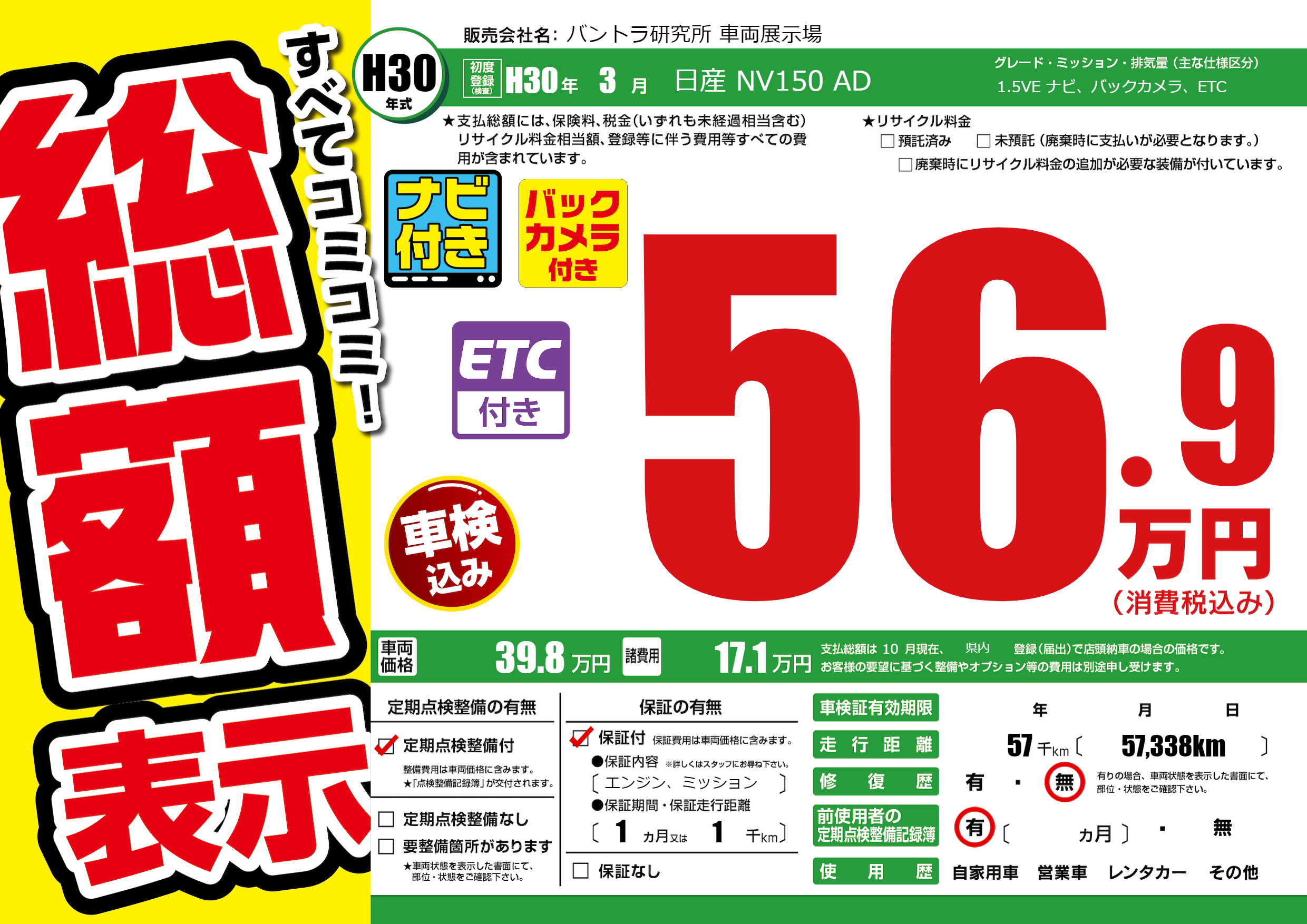 | 車名 | 日産 NV150 AD | グレード ミッション 排気量 |