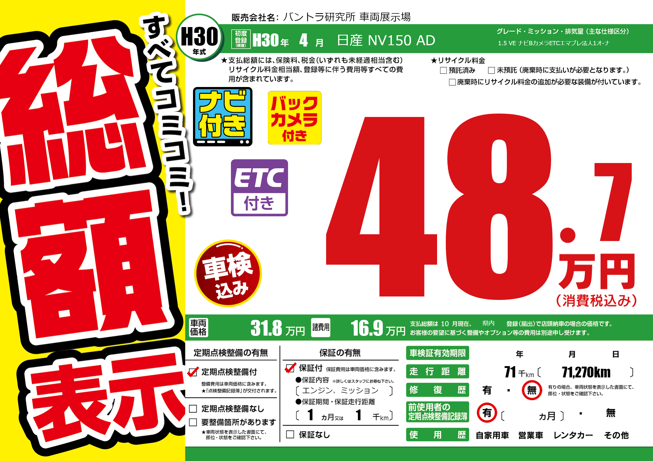 | 車名 | 日産 NV150 AD | グレード ミッション 排気量 |