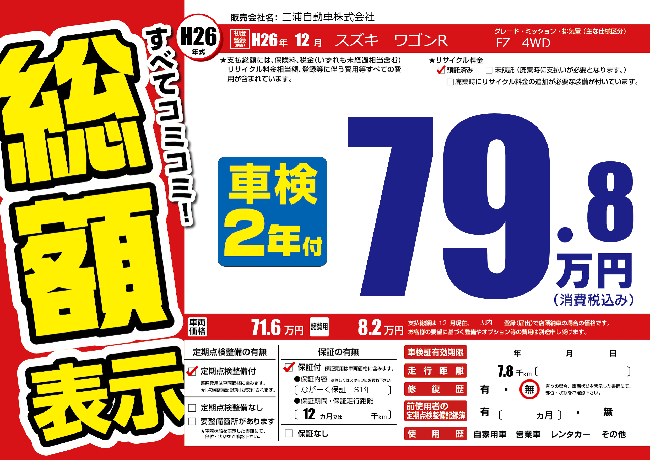 | 車名 | スズキ ワゴンR | グレード ミッション 排気量 |