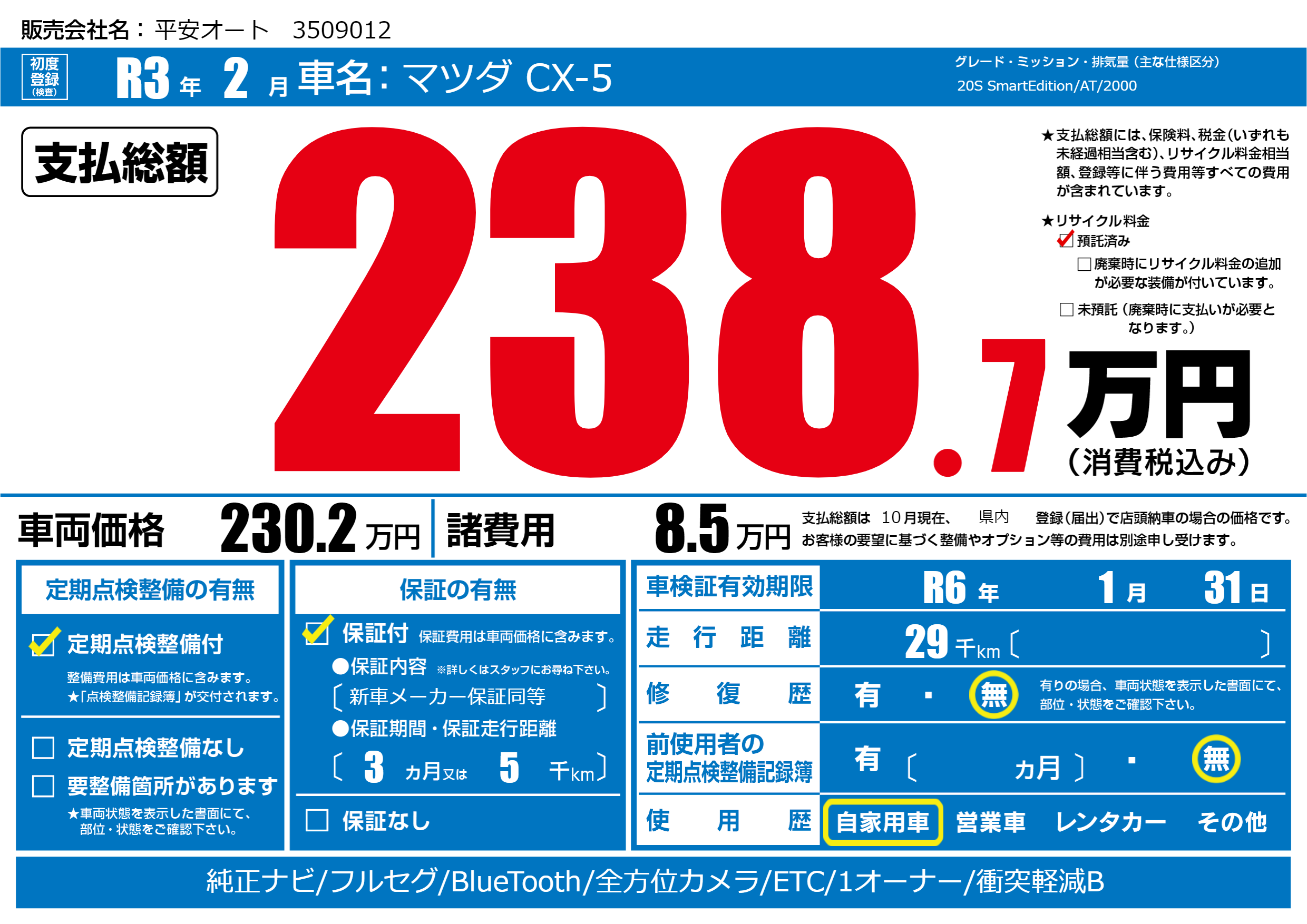 | 車検制限 | R6年 1月 31日 | ||