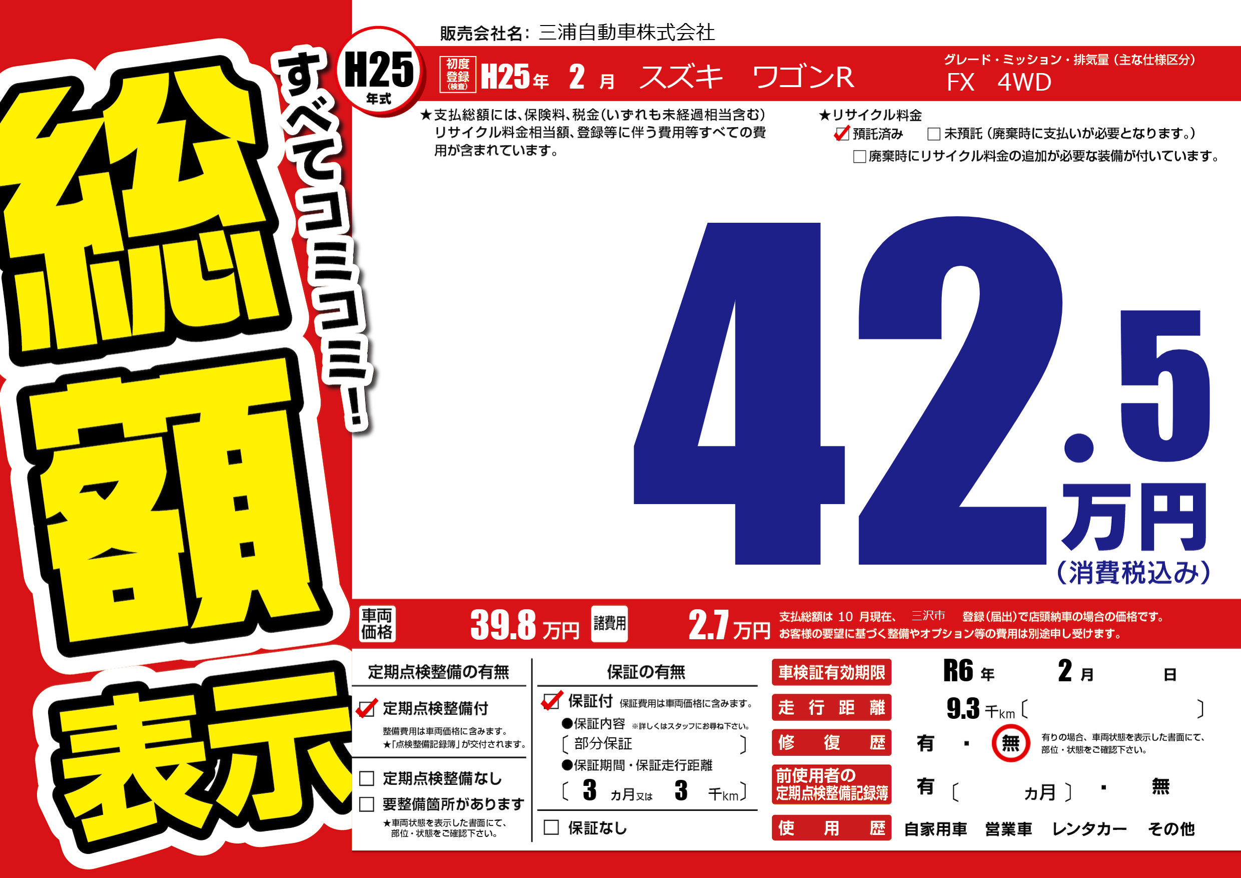 | 車名 | スズキ ワゴンR | グレード ミッション 排気量 |