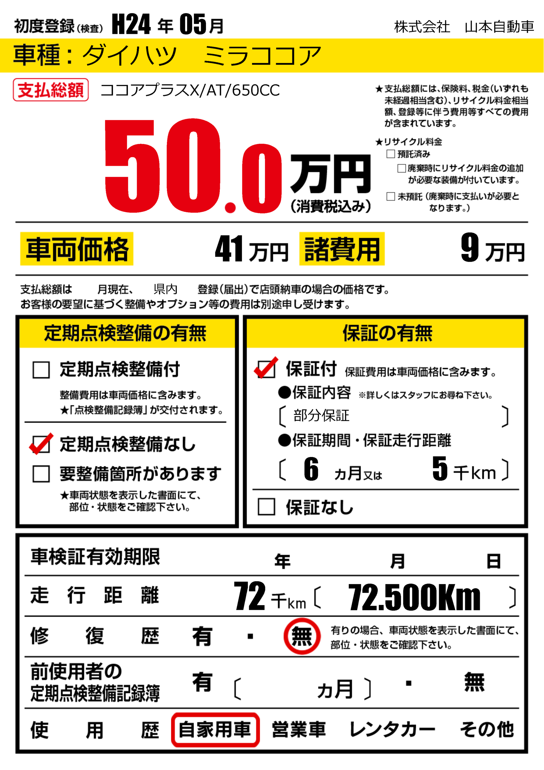 | 走行キロ | 7.2万km | 初年度登録 | H24年05月 |