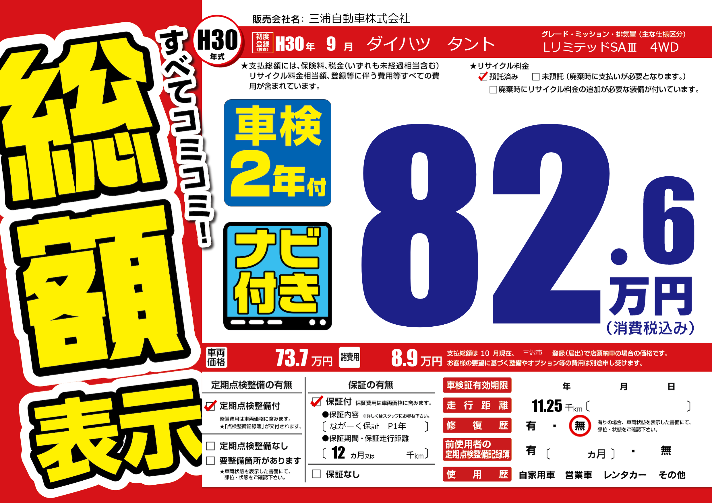 | 車名 | ダイハツ タント | グレード ミッション 排気量 |