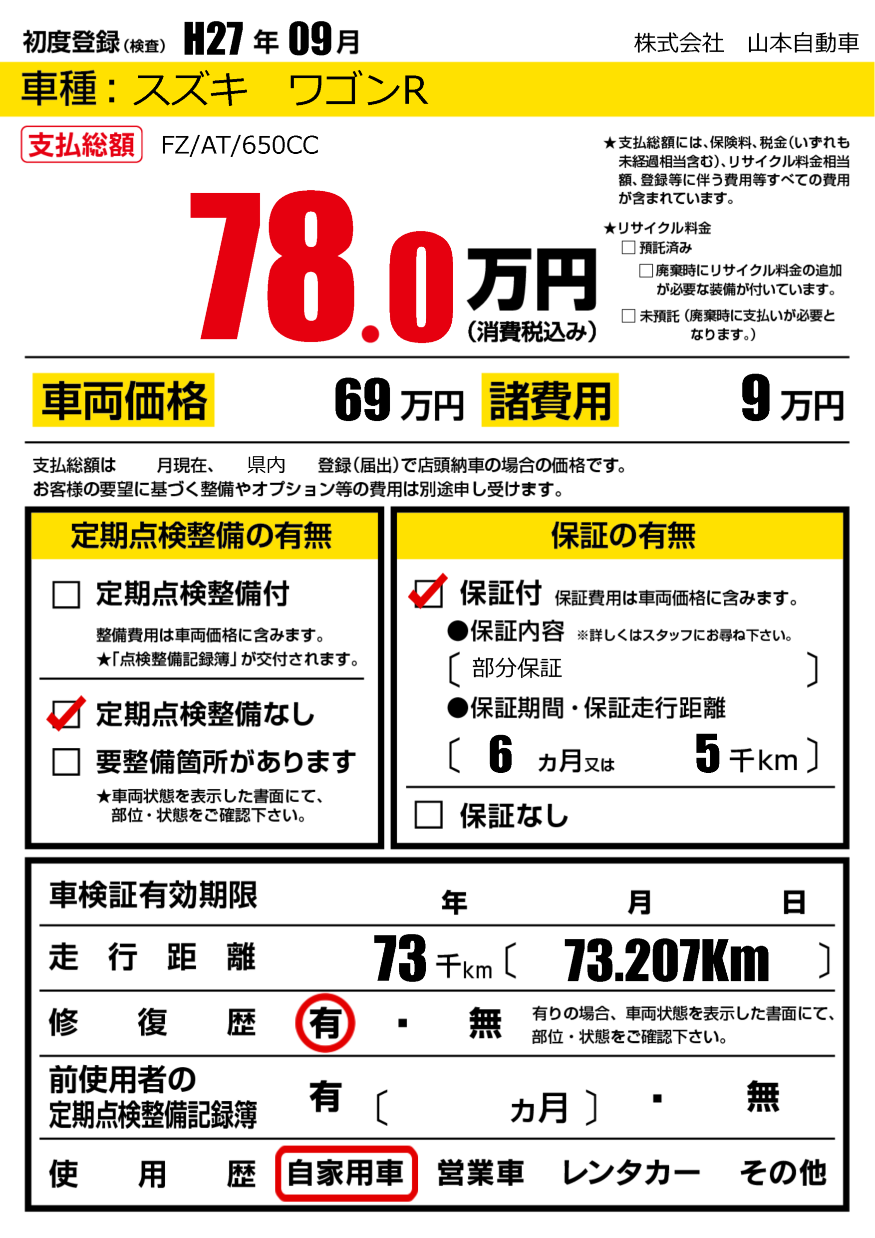 | 走行キロ | 7.3万km | 初年度登録 | H27年09月 |