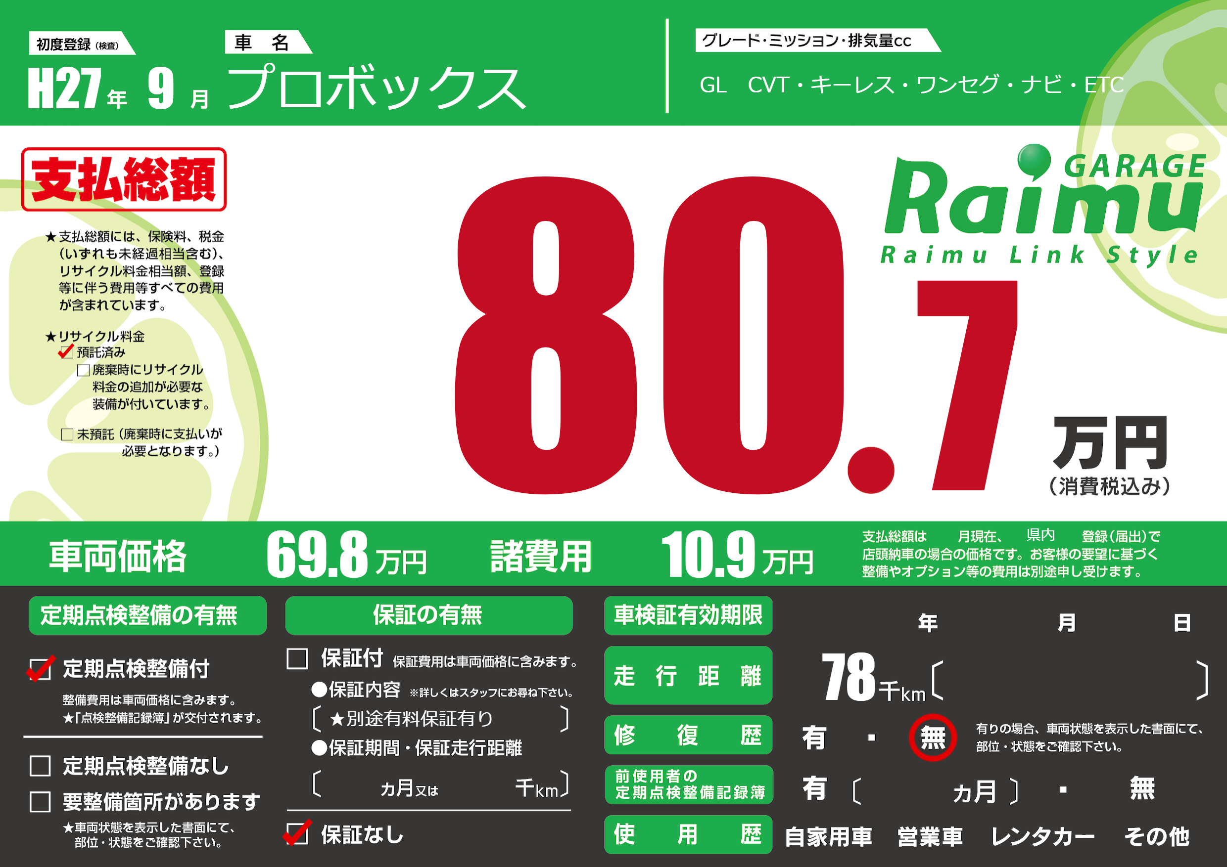 | 車名 | プロボックス | グレード ミッション 排気量 |
