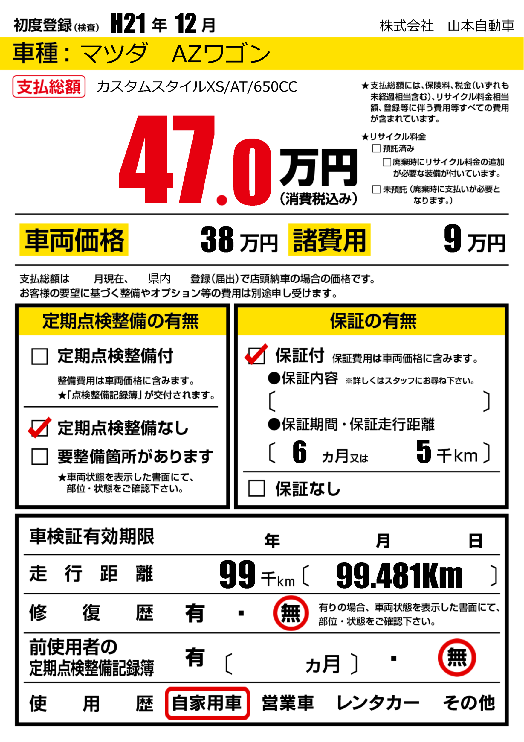 保証付き 保証内容(---) 6ヶ月または(5)千kmまで |