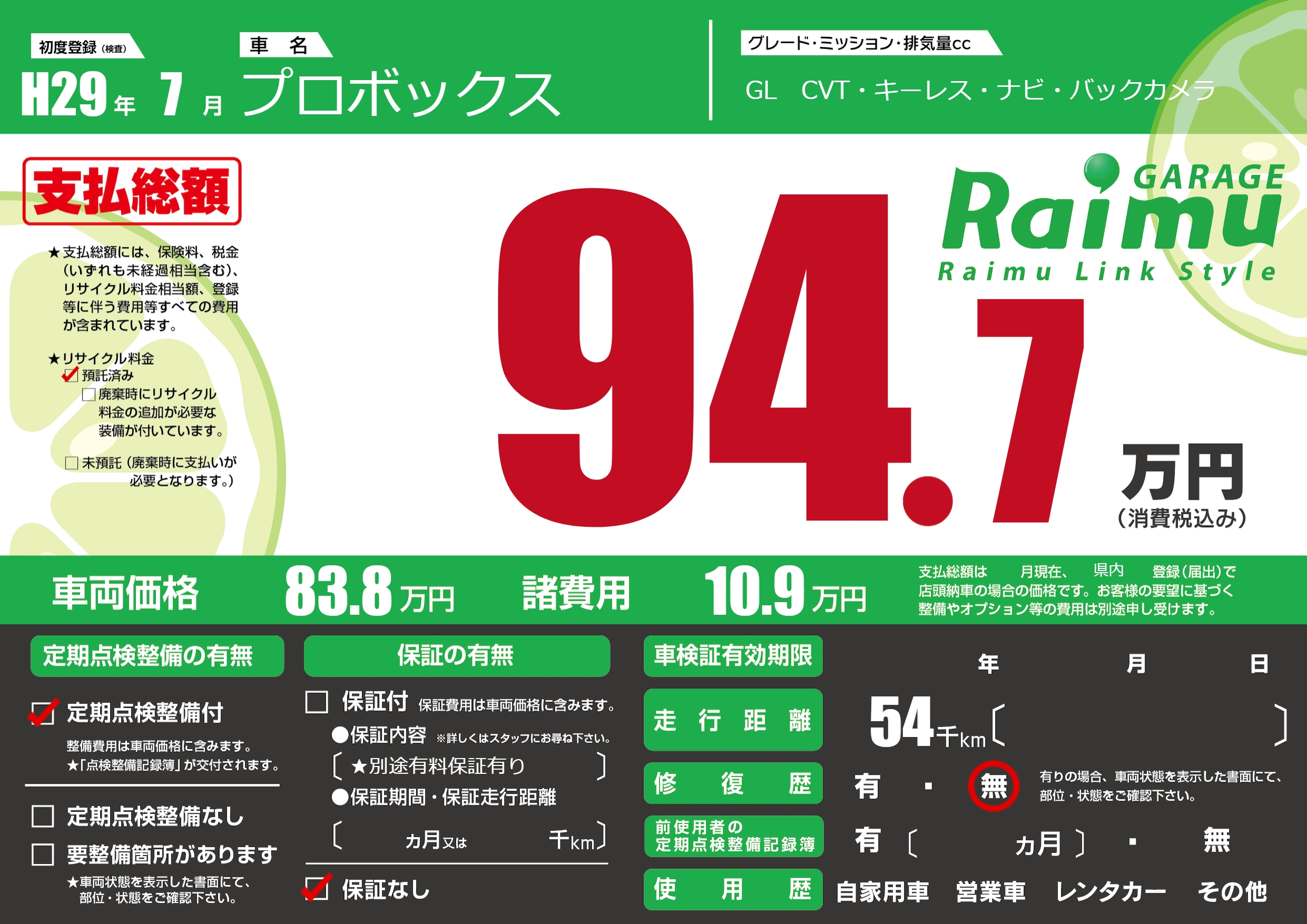 | 車名 | プロボックス | グレード ミッション 排気量 |