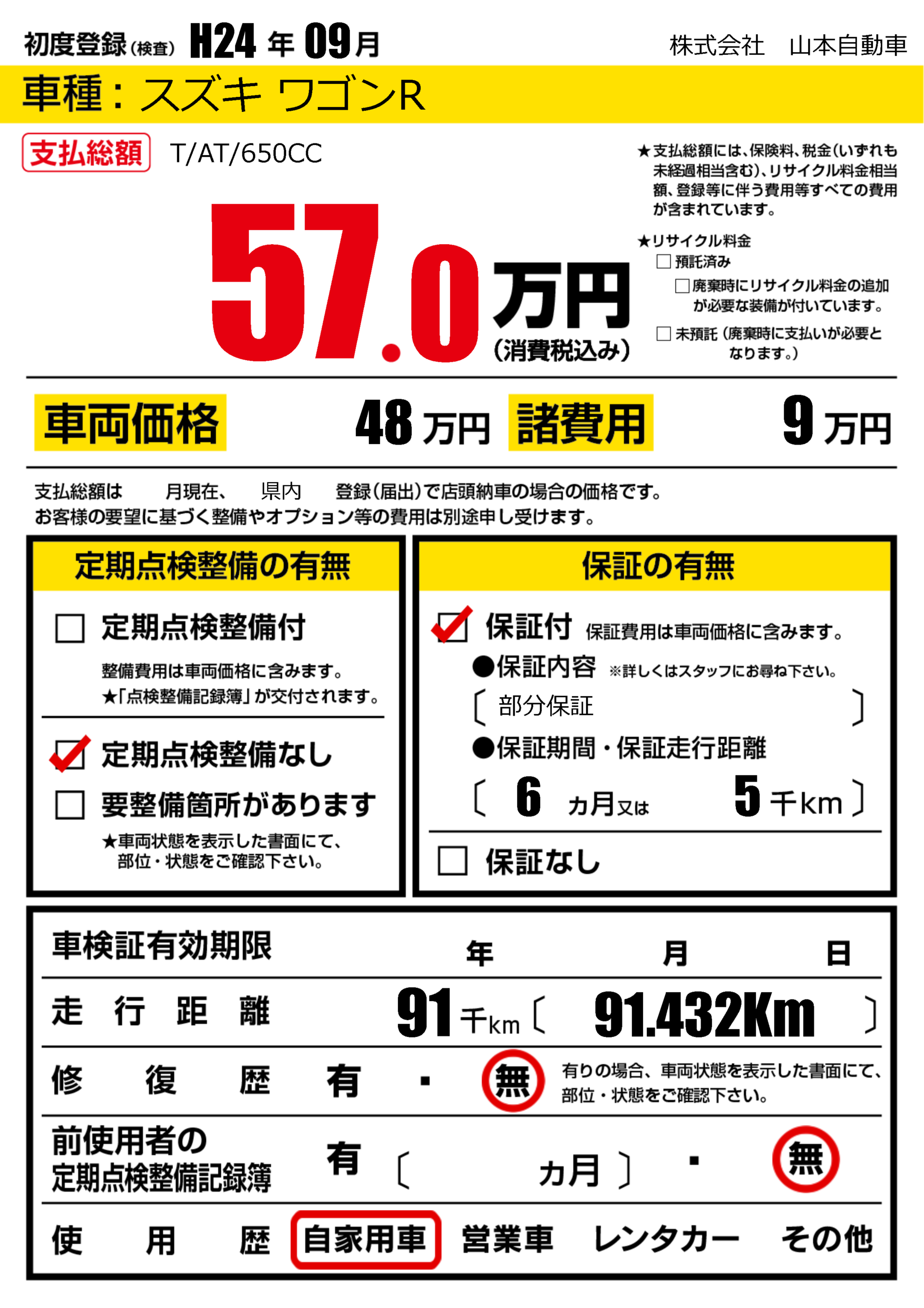 | 走行キロ | 9.1万km | 初年度登録 | H24年09月 |