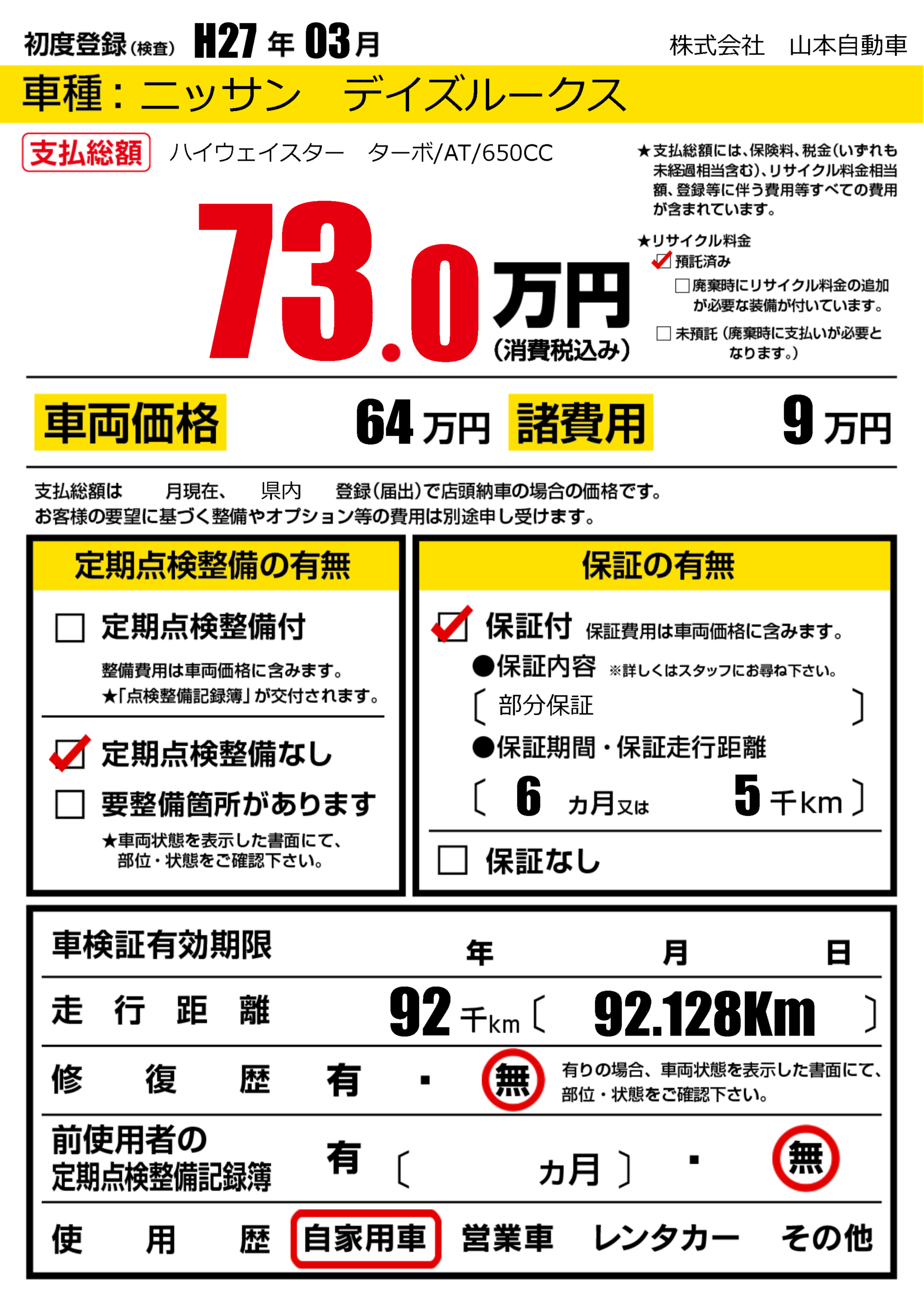 | 走行キロ | 9.2万km | 初年度登録 | H27年03月 |