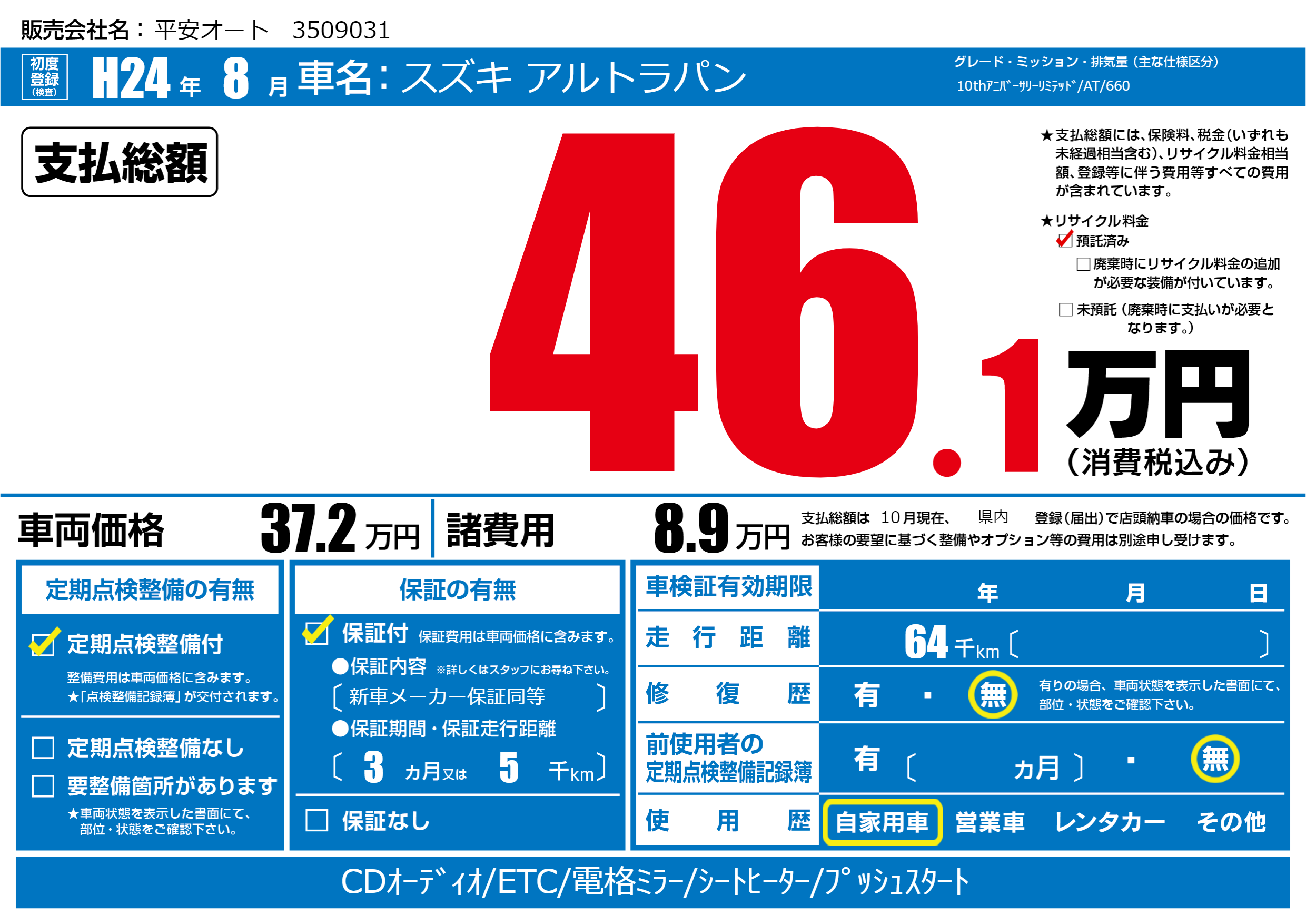 | 走行キロ | 6.4万km | 初年度登録 | H24年8月 |