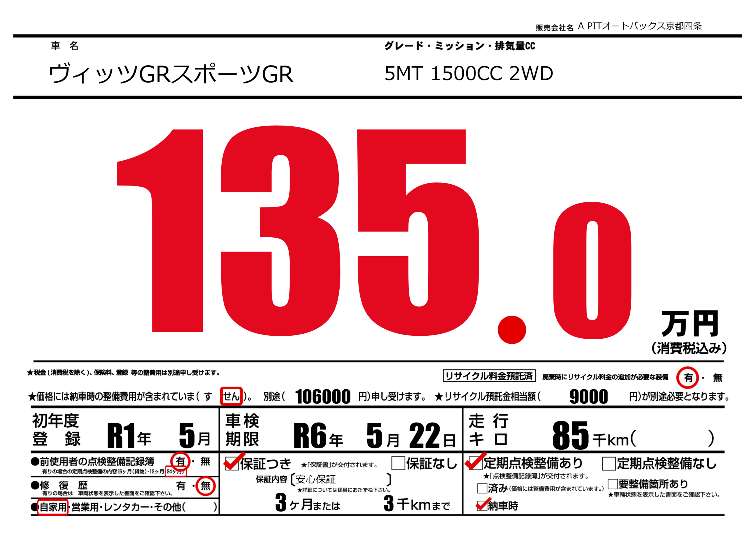 | 車名 | ヴィッツGRスポーツGR | グレード ミッション 排気量 |