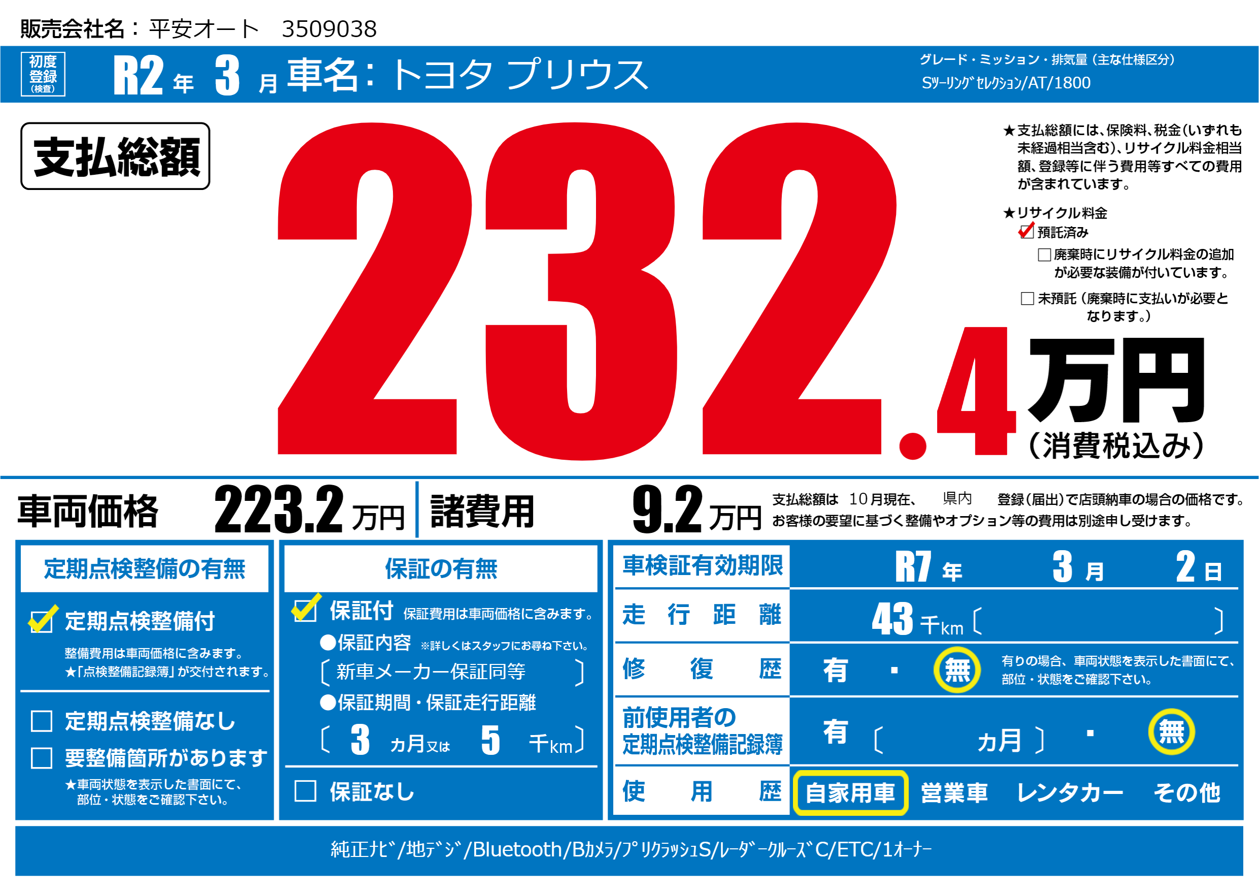 | 車名 | トヨタ プリウス | グレード ミッション 排気量 |
