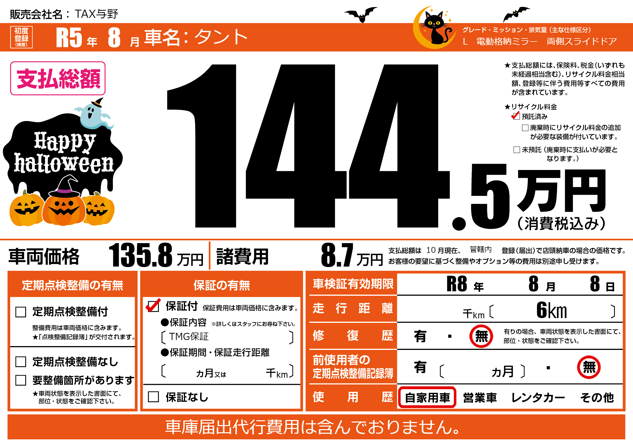 | 走行キロ | - | 初年度登録 | R5年8月 |