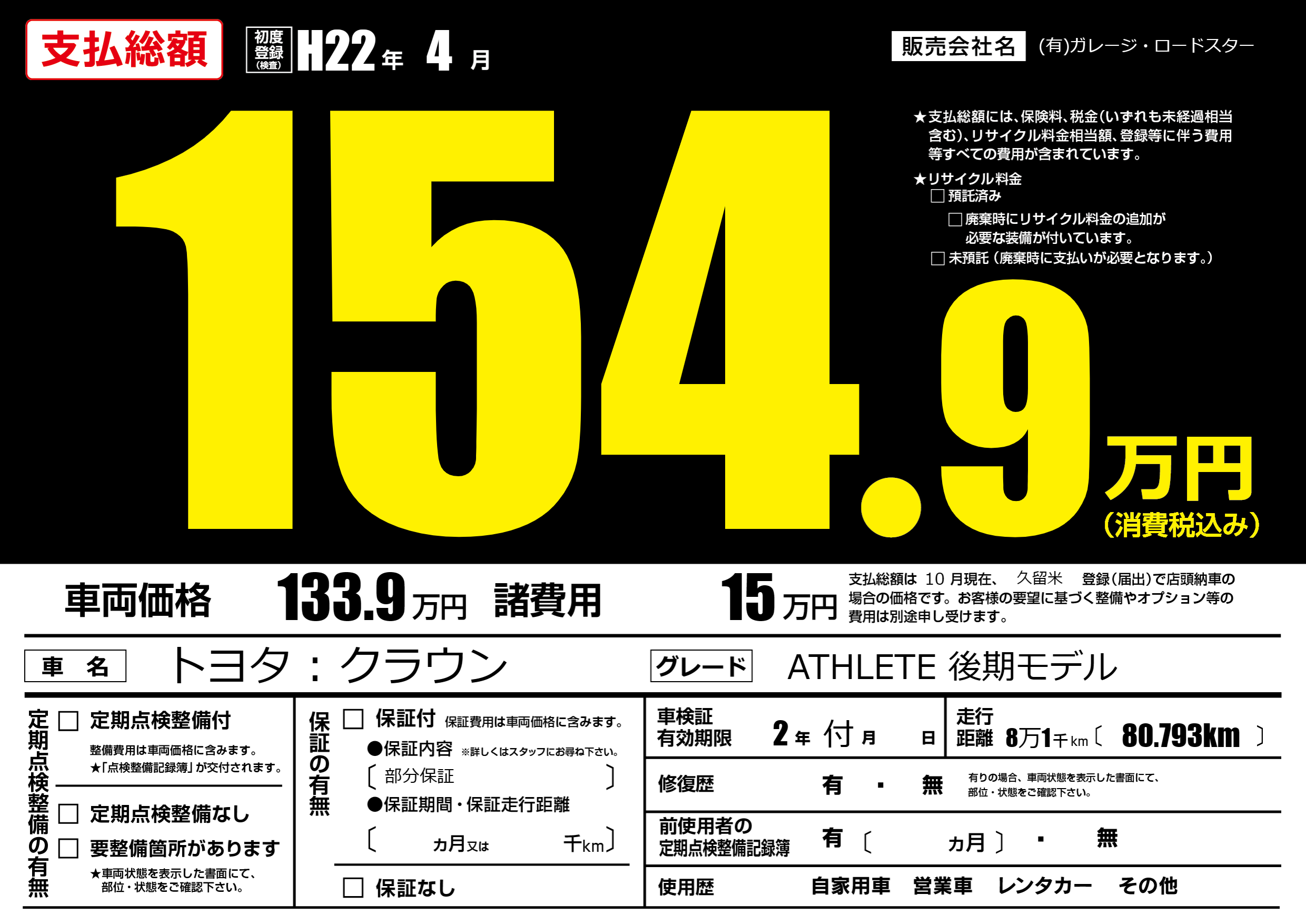 | 走行キロ | 0.8万km | 初年度登録 | H22年4月 |