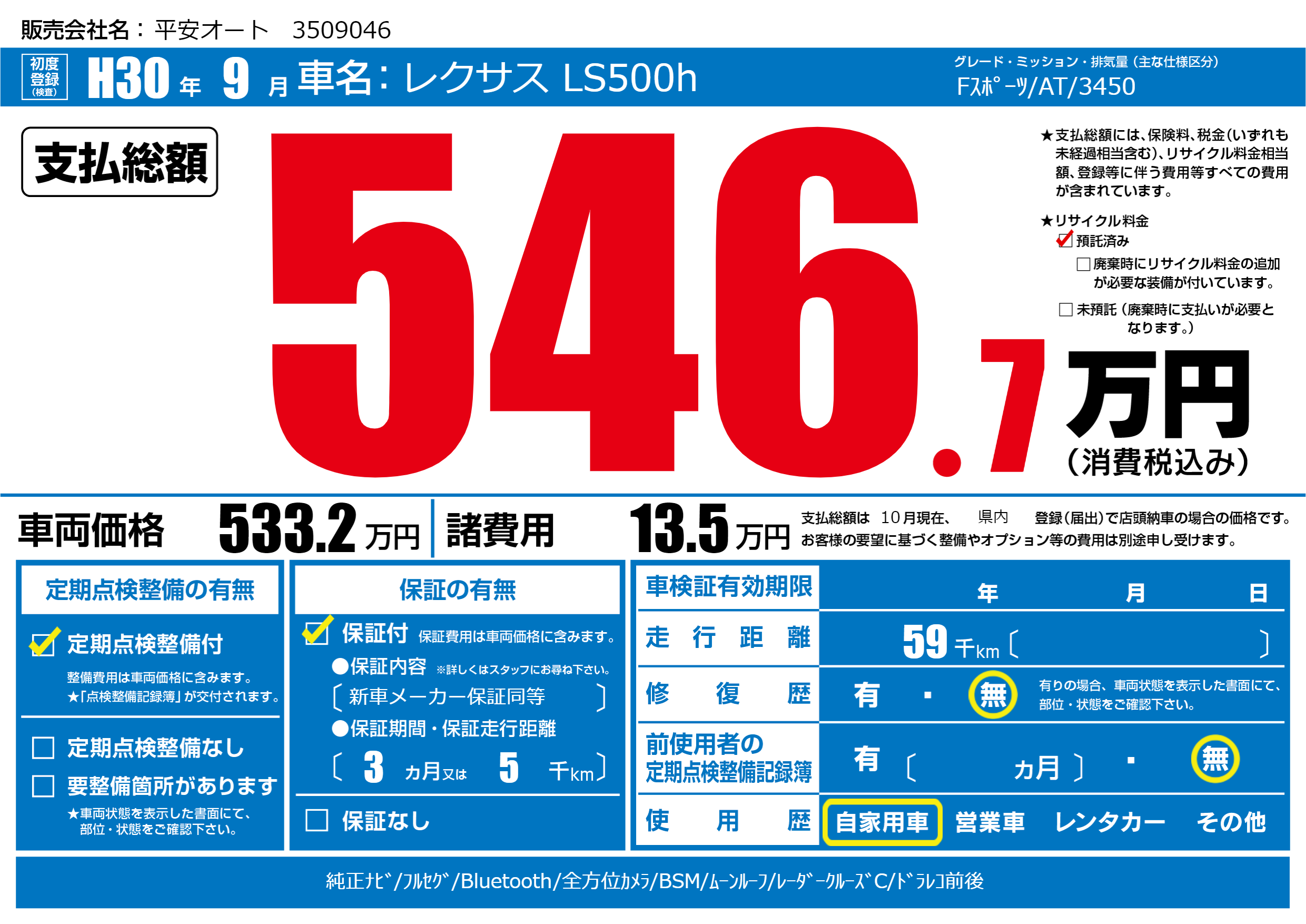 | 車名 | レクサス LS500h | グレード ミッション 排気量 |