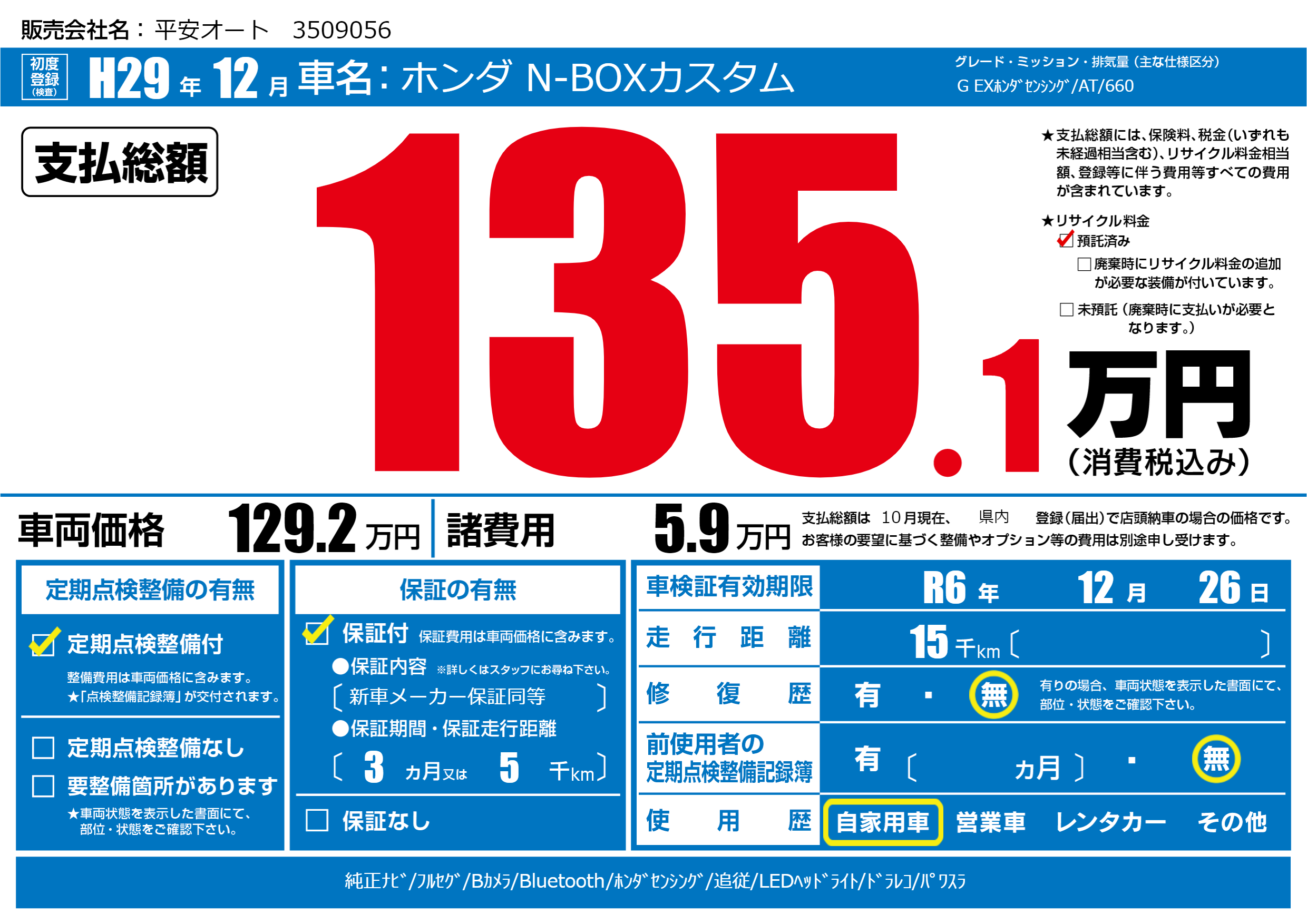 | 車名 | ホンダ N-BOXカスタム | グレード ミッション 排気量 |