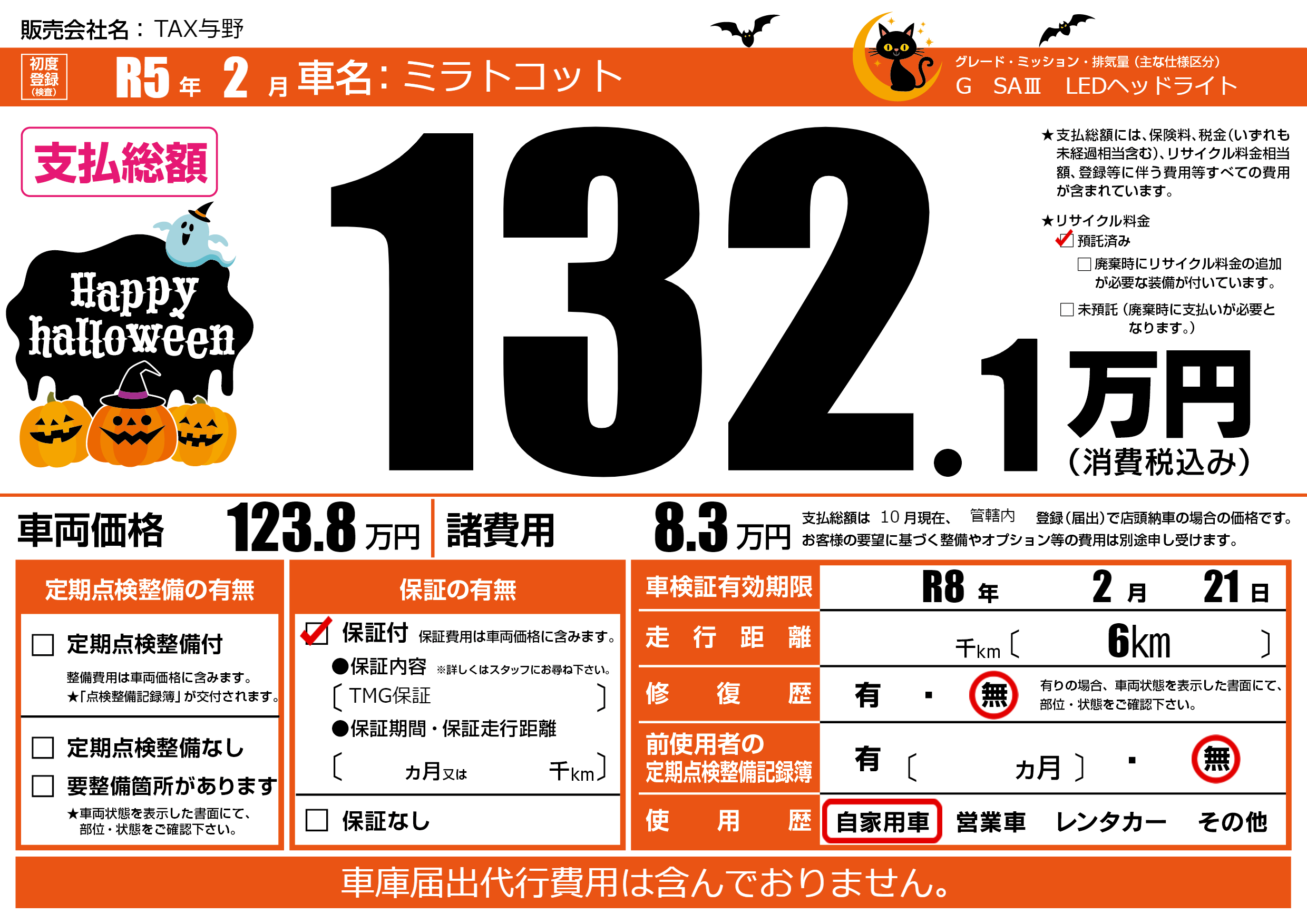 保証付き 保証内容(TMG保証) ---ヶ月または()千kmまで |