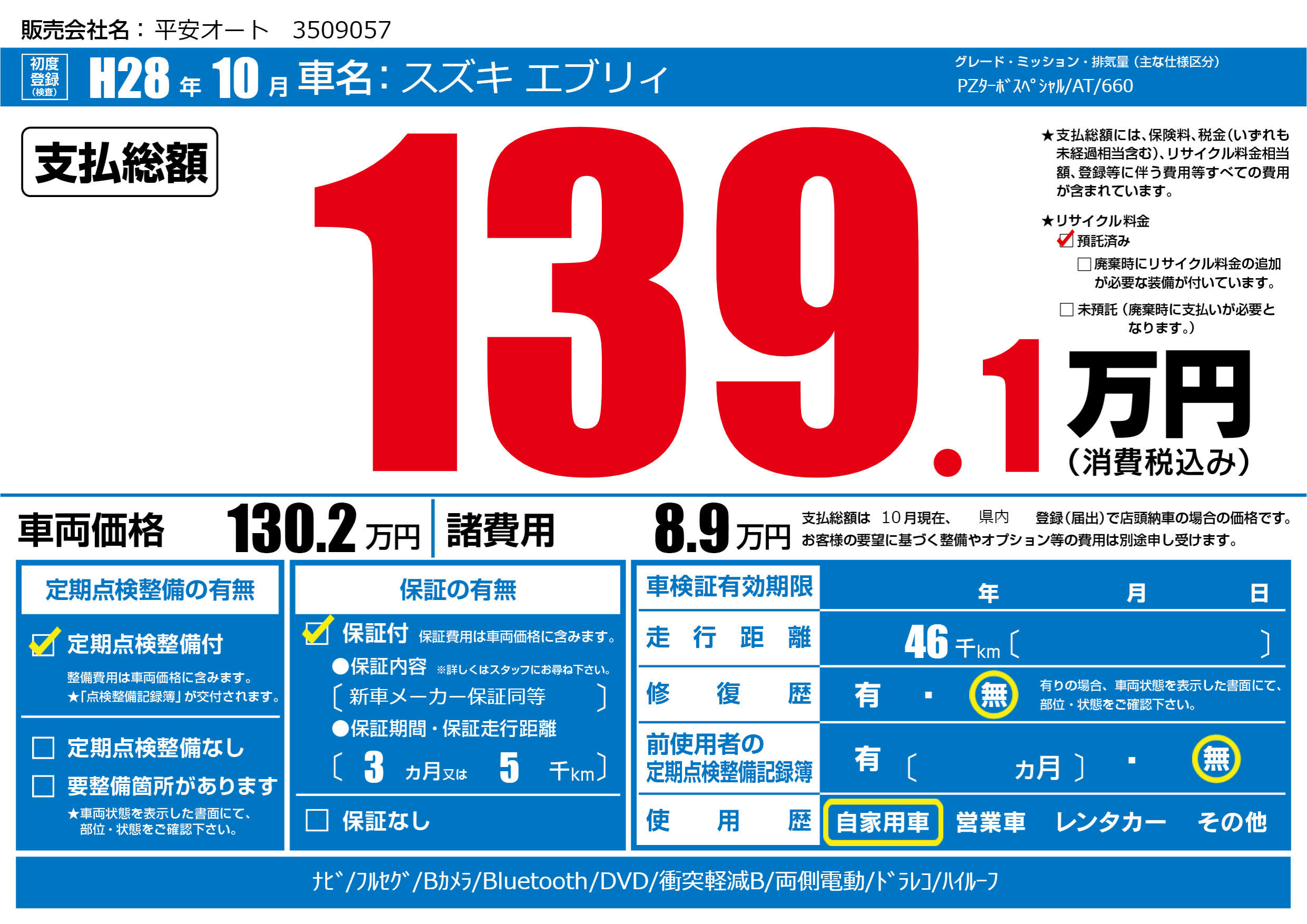 | 車名 | スズキ エブリィ | グレード ミッション 排気量 |