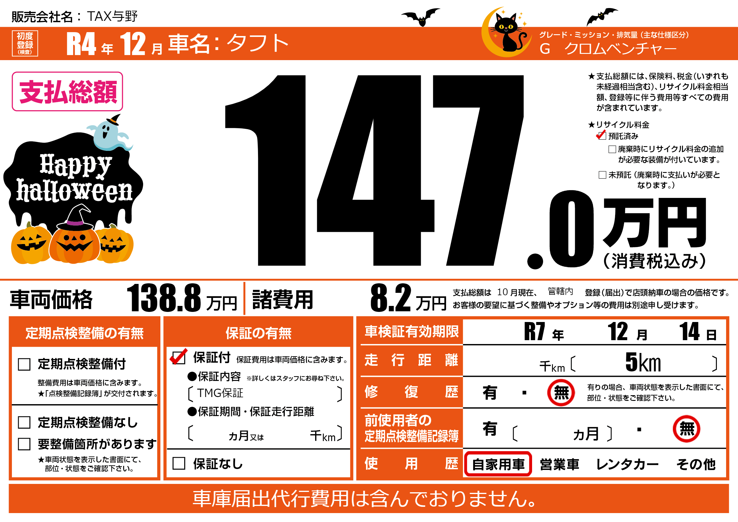 保証付き 保証内容(TMG保証) ---ヶ月または()千kmまで |