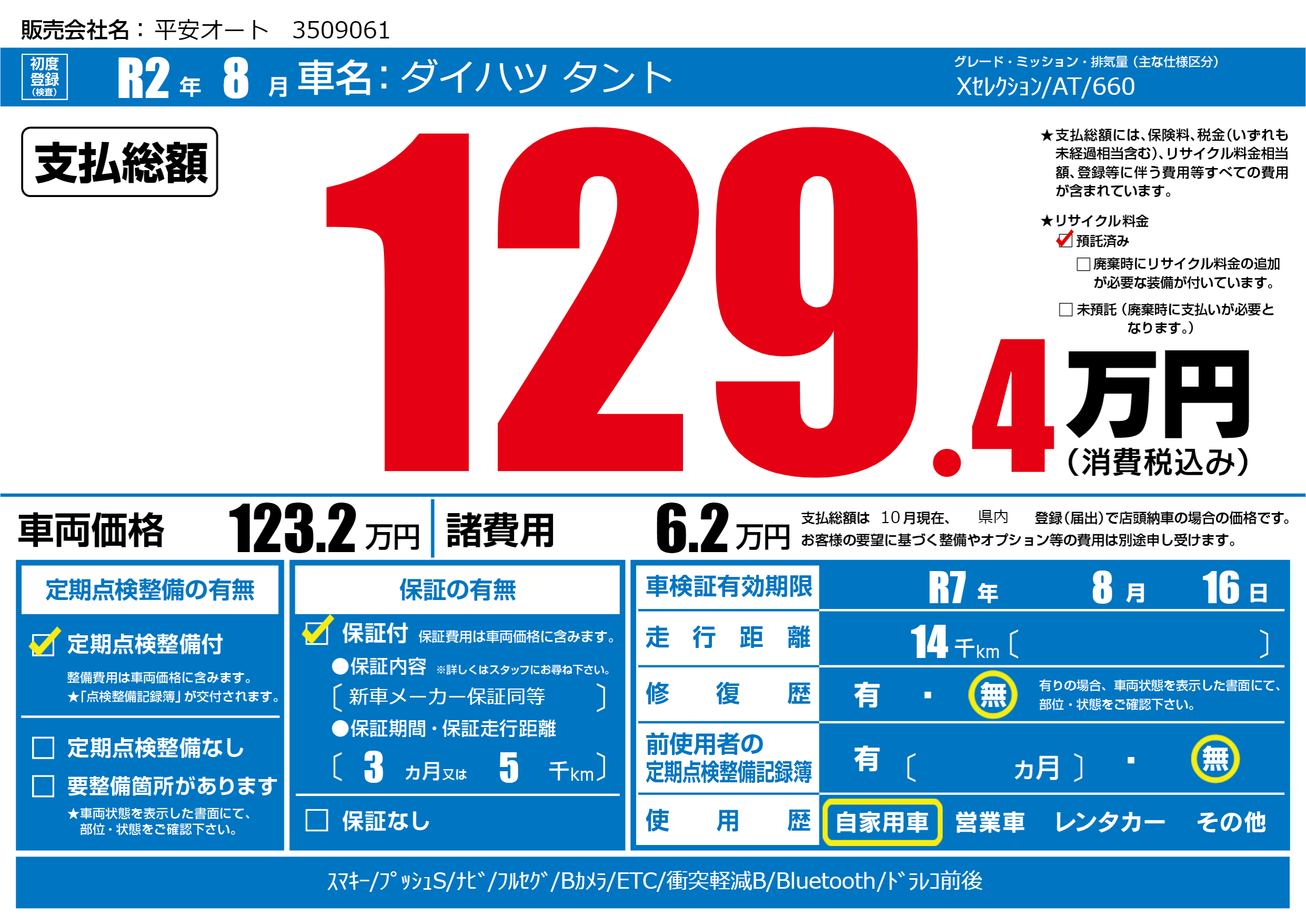 | 走行キロ | 1.4万km | 初年度登録 | R2年8月 |