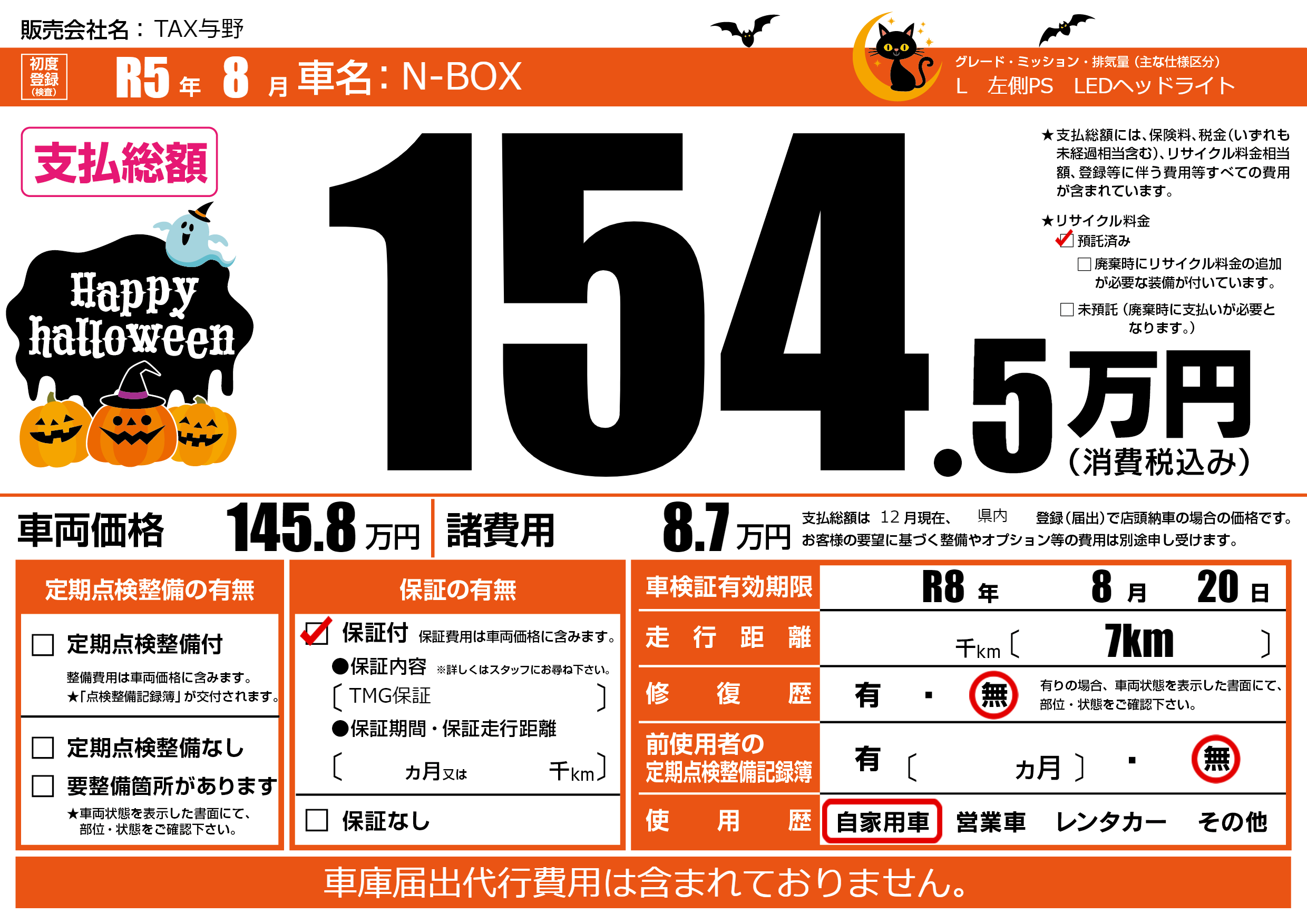 | 走行キロ | - | 初年度登録 | R5年8月 |
