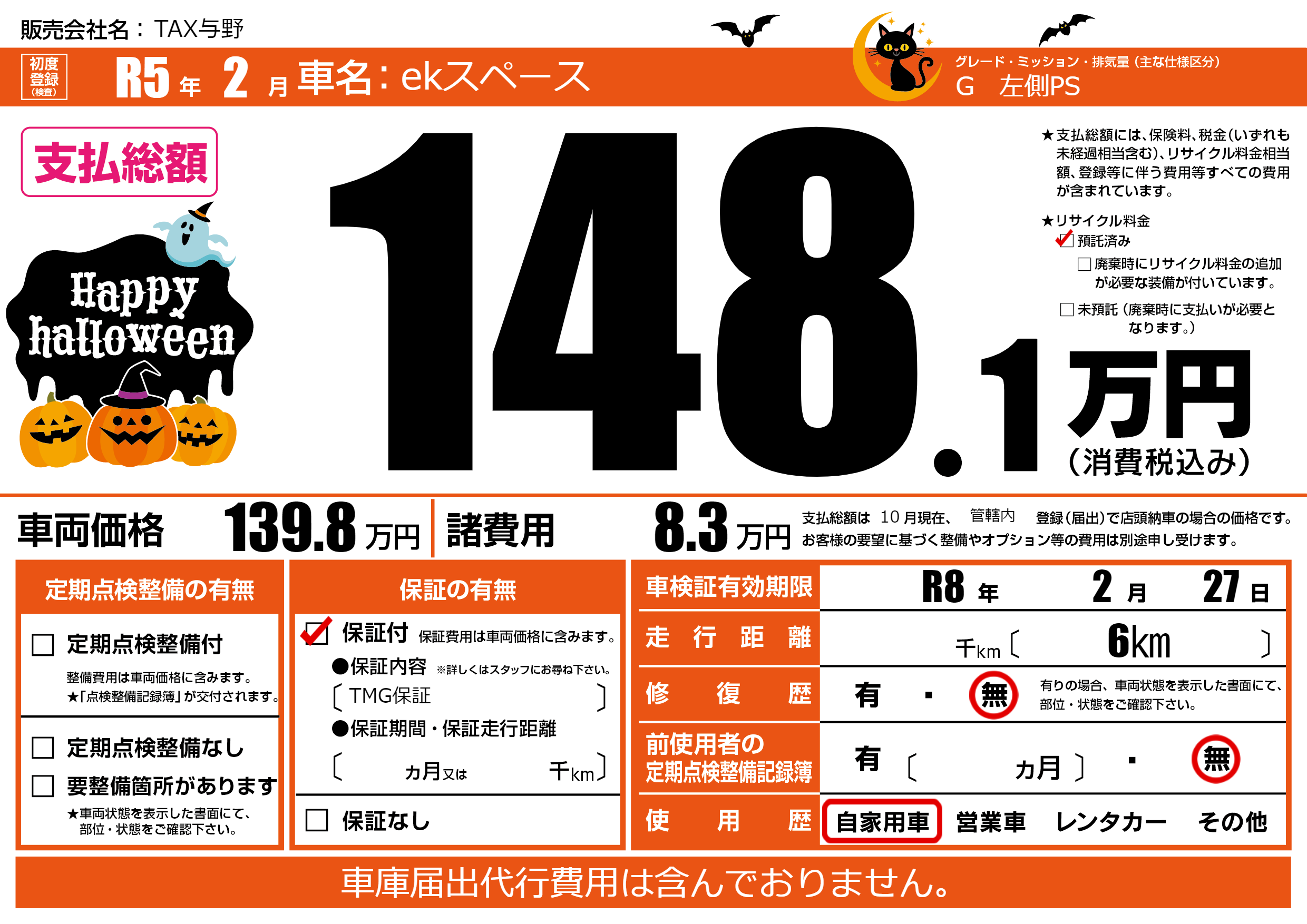 保証付き 保証内容(TMG保証) ---ヶ月または()千kmまで |