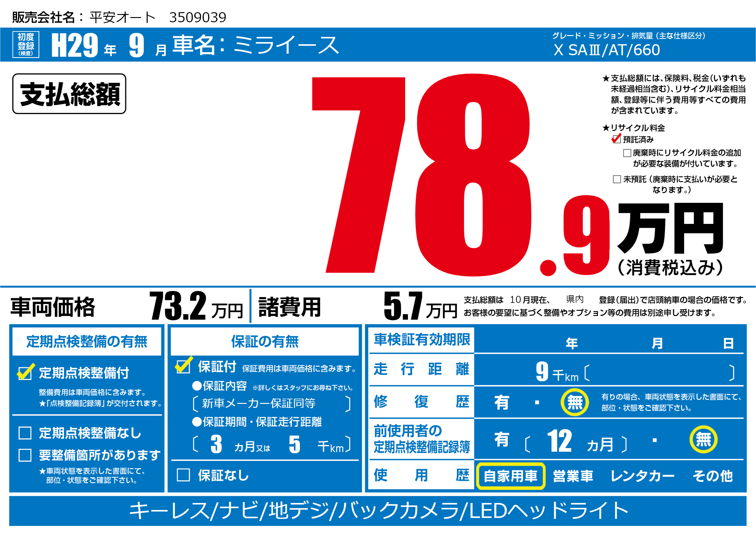 | 走行キロ | 0.9万km | 初年度登録 | H29年9月 |