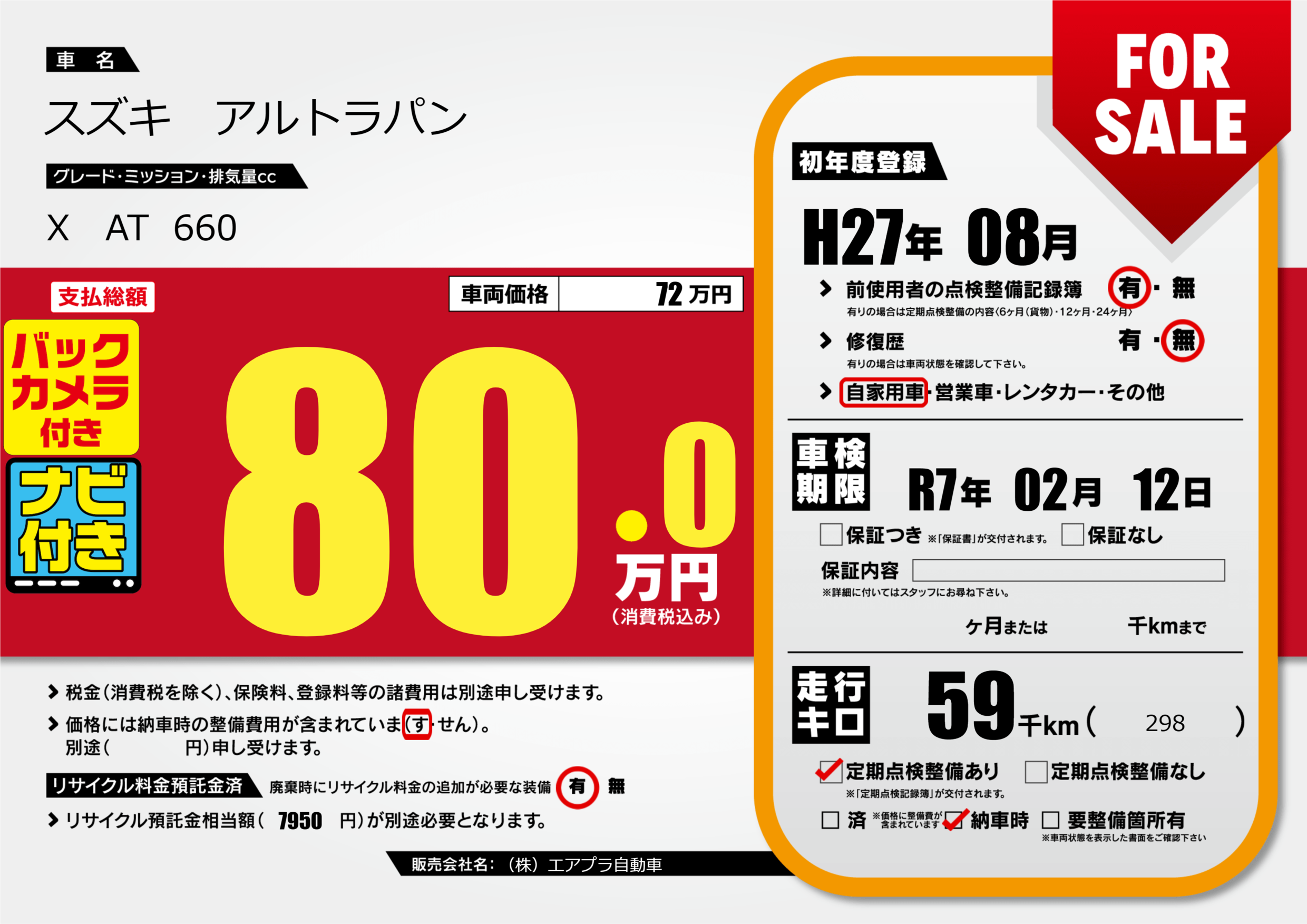 あり | 車検制限 | R7年02月12月 |