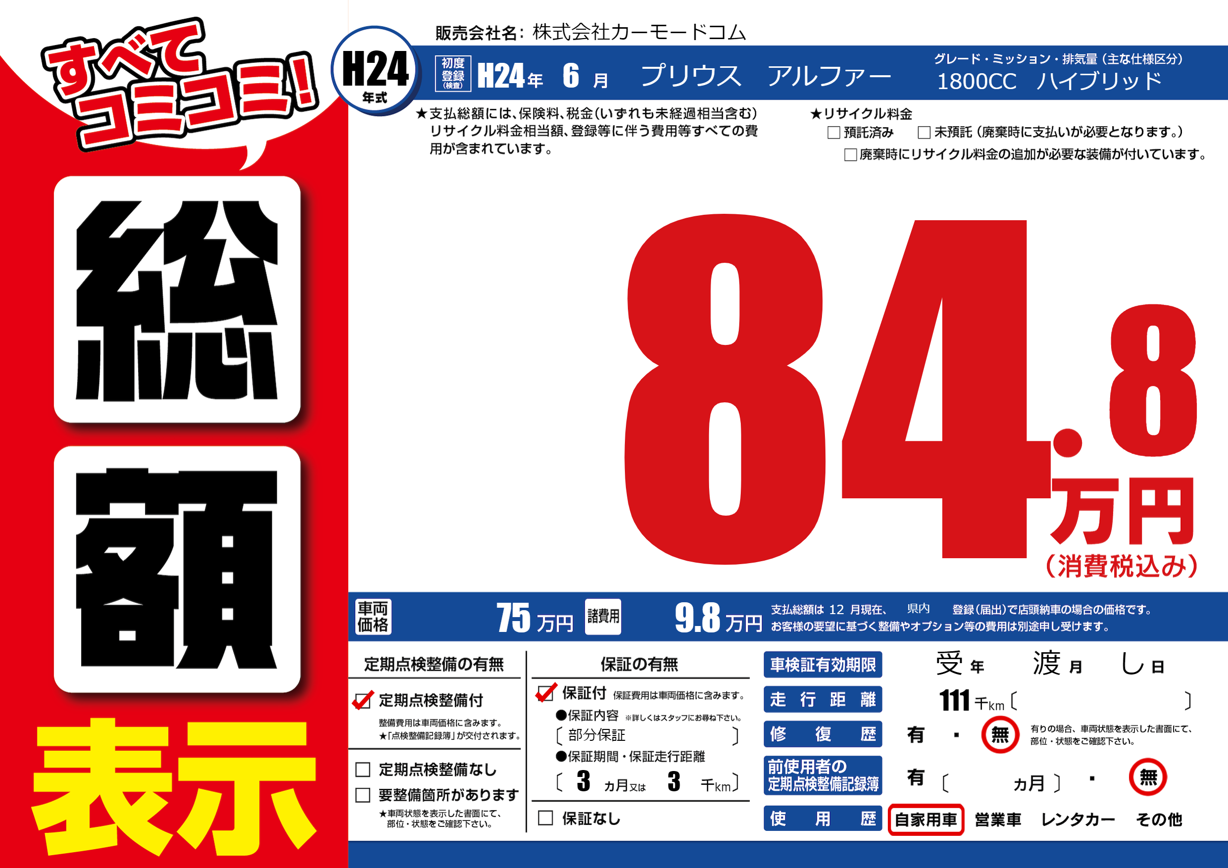 | 車名 | プリウス アルファー | グレード ミッション 排気量 |