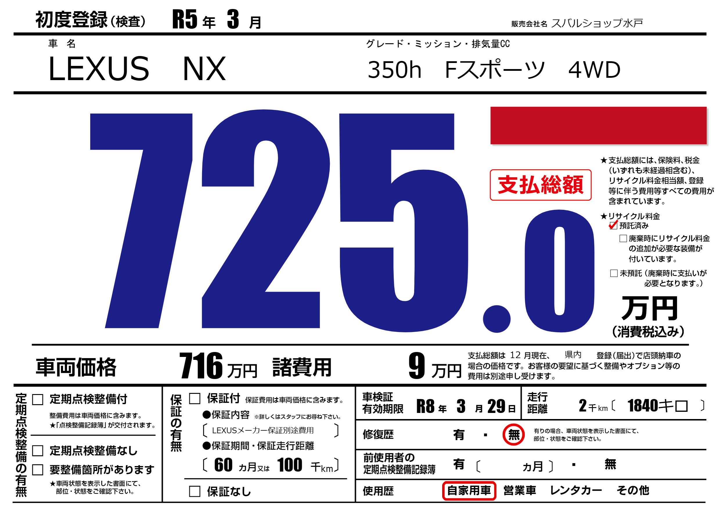 保証なし 保証内容(LEXUSメーカー保証別途費用) 60ヶ月または(100)千kmまで |