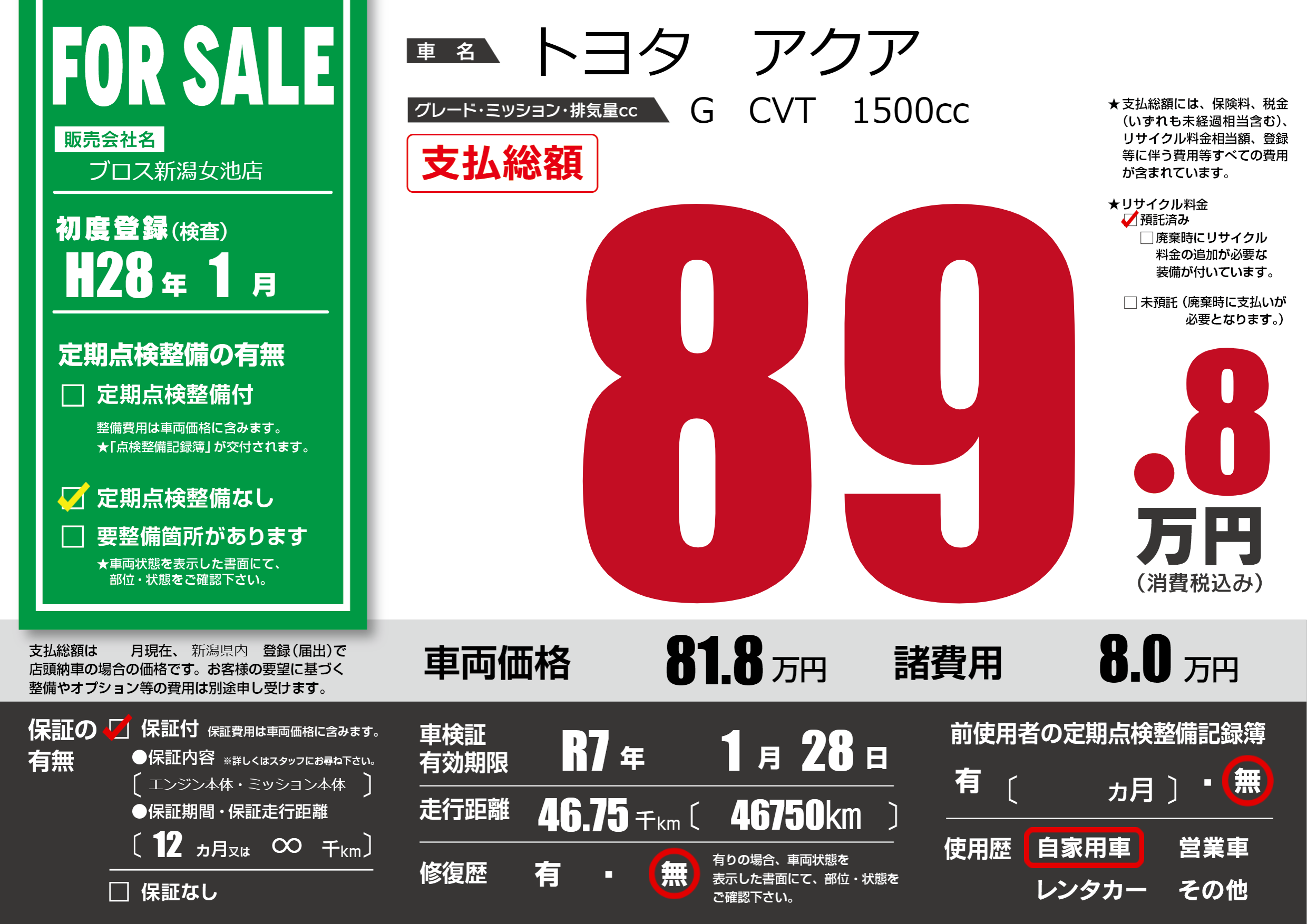 | 車名 | トヨタ アクア | グレード ミッション 排気量 |