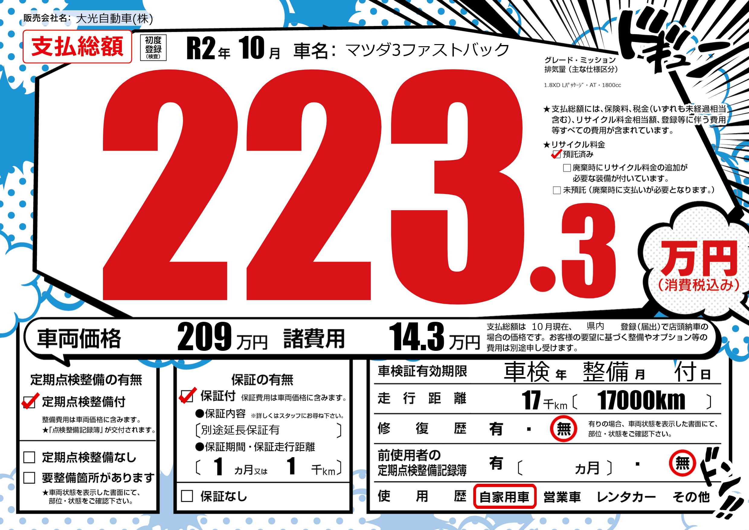 | 車名 | マツダ3ファストバック | グレード ミッション 排気量 |
