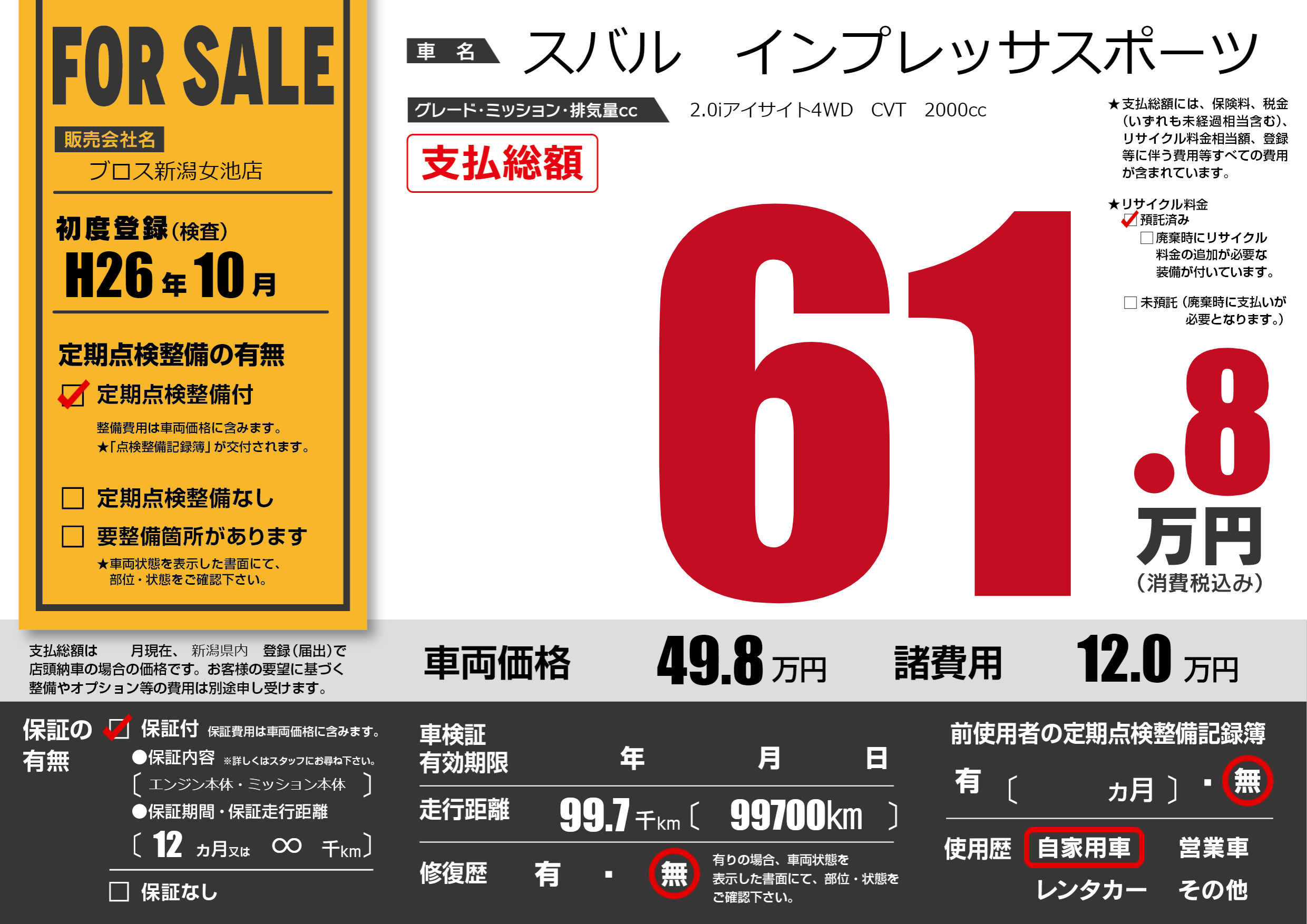 | 車名 | スバル インプレッサスポーツ | グレード ミッション 排気量 |