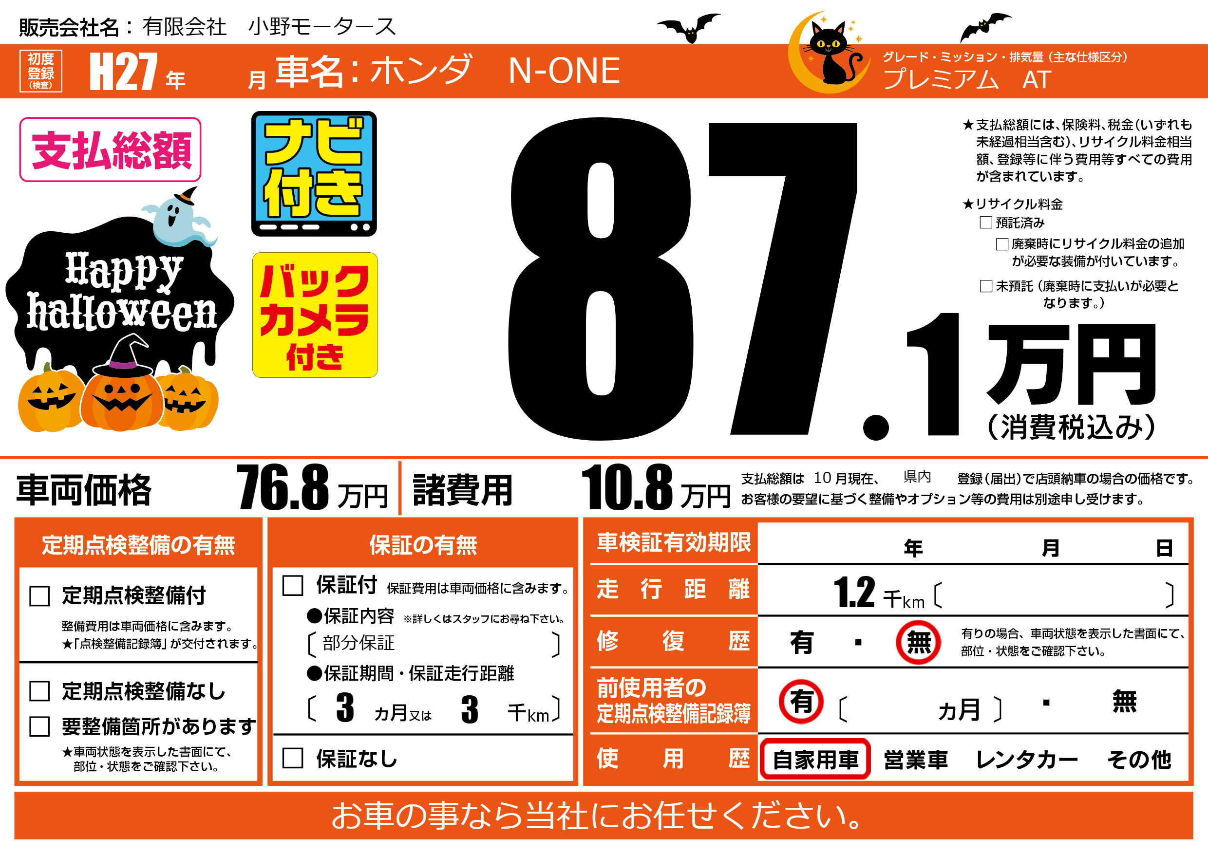 | 車名 | ホンダ N-ONE | グレード ミッション 排気量 |