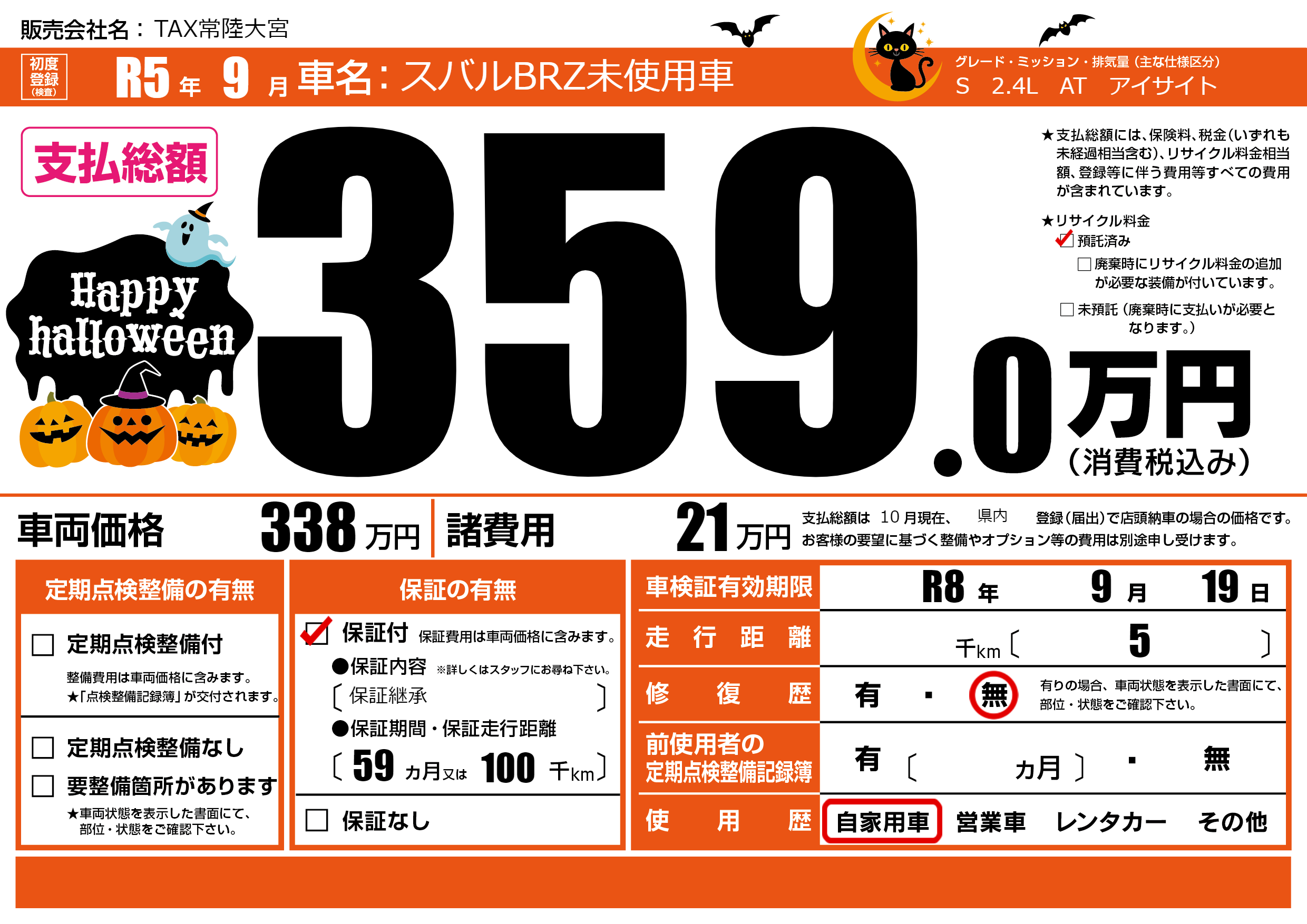 | 車名 | スバルBRZ未使用車 | グレード ミッション 排気量 |