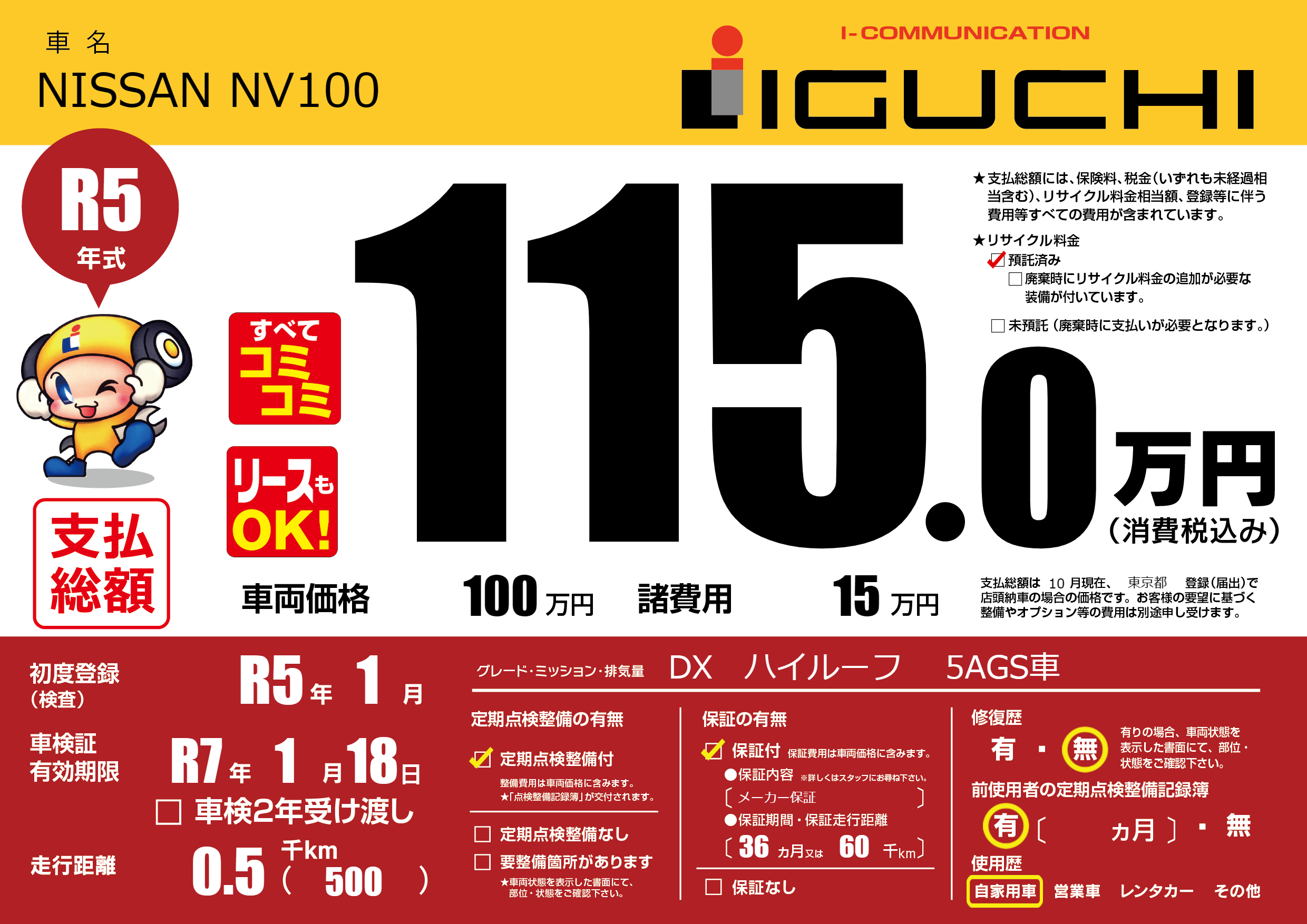 | 車名 | NISSAN NV100 | グレード ミッション 排気量 |